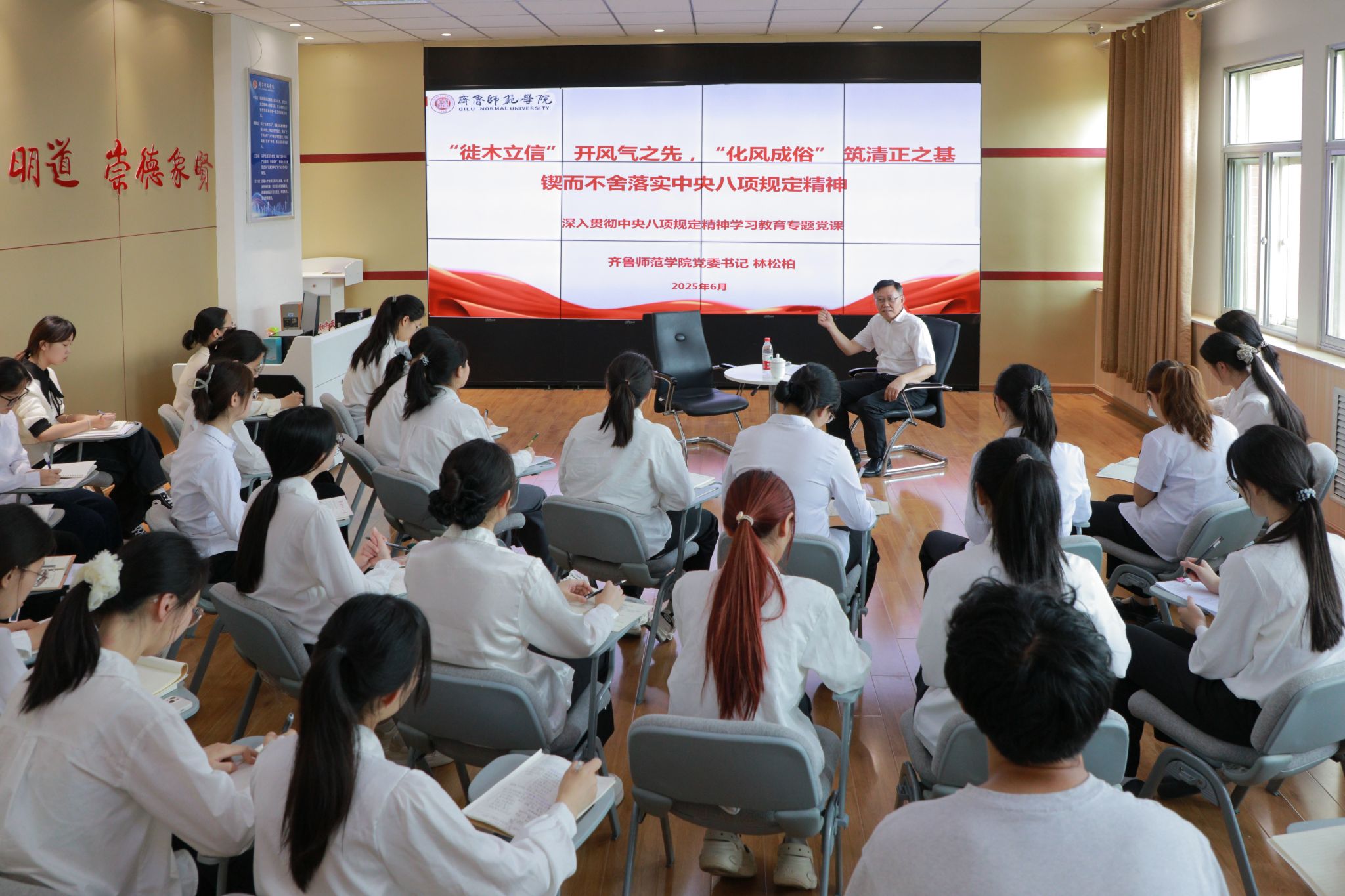 为推动深入贯彻中央八项规定精神学习教育扎实开展,6月24日,学校党委书记林松柏为马克思主义学院学生党支部党员作深入贯彻中央八项规定精神学习教育专题党课。学院党委书记郭百灵、副院长祁凯丽、党委副书记毛雯、团总支书记王雅文以及学生党支部全体成员、2023级发展对象与入党积极分子现场聆听。活动由郭百灵主持。