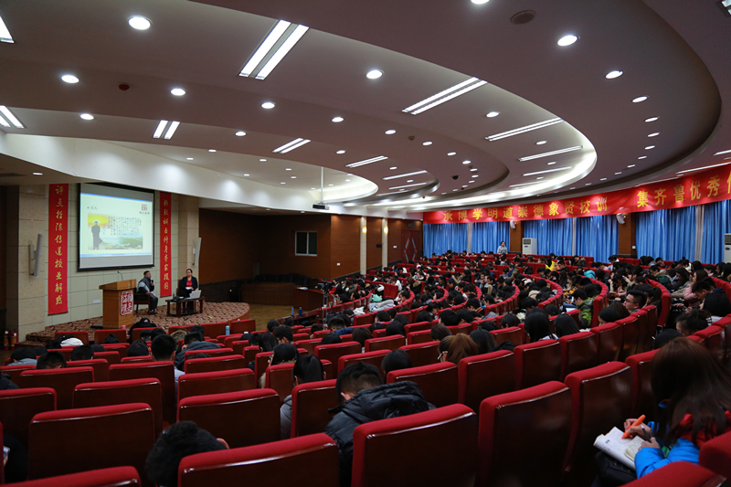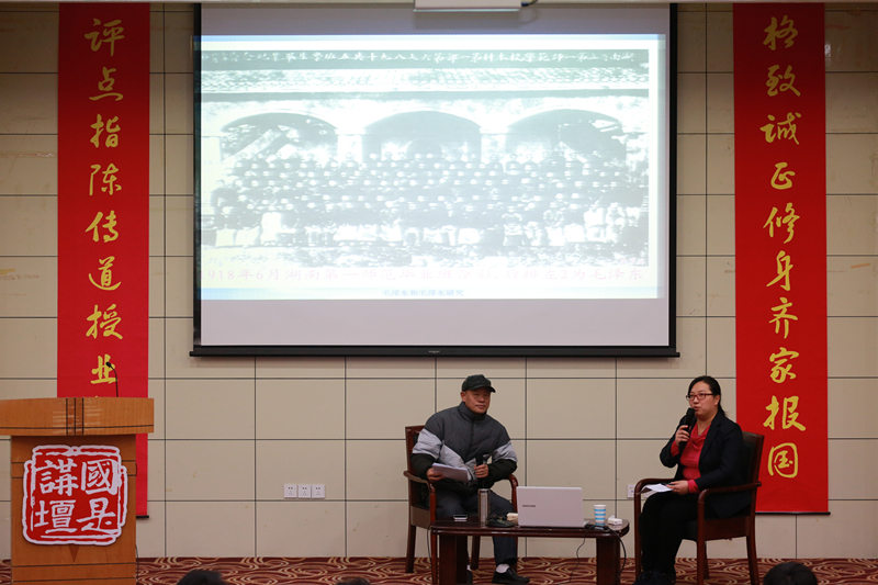 伴随着歌唱毛泽东主席经典歌曲的音乐,讲座正式开始。两位老师同台而坐,以访谈交流的形式围绕主题进行了精彩讲解。宋继和教授首先对毛泽东的生平进行了详细介绍。随后,他指出,毛泽东是一集政治家、革命家、理论家、思想家、军事家、书法家、诗人等于一身的一代伟人和民族英雄,并对毛泽东多方面的才能和贡献作了详细论述。刘金玲老师则对毛泽东对中国革命和建设所立下的丰功伟绩予以科学评价。对于毛泽东晚年所犯的错误,宋教授依据《关于建国以来党的若干历史问题的决议》指出,毛泽东的功绩是第一位的,错误是第二位的,“纵论功过,伟绩经天错居二;科学把握,切忌片面形上学”。最后,宋教授结合关于毛泽东的形式和内容各异的书籍,对中外研究毛泽东的现实情况进行了详细解读。随后,讲座进入自由提问环节,现场人员积极提问,宋教授就在场同学所提问题给予了回答,并赠予珍贵书籍留作纪念。