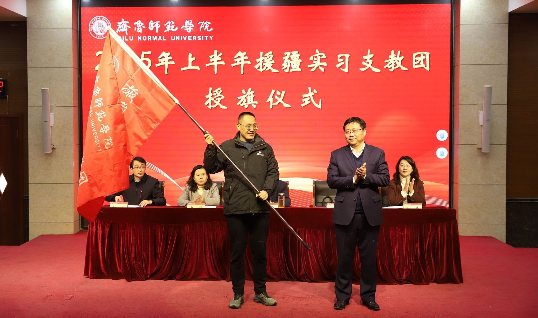 仪式上,郑秀文为援疆实习支教团授旗。这面旗帜见证了前六批支教团在新疆喀什麦盖提县的辛勤付出,承载着学校的期望与支教团的使命。如今,旗帜交到第七批支教团手中,激励着他们继承前辈们的精神,汲取过往经验,在接下来的支教旅程中,全力以赴投入到教育援疆工作中。