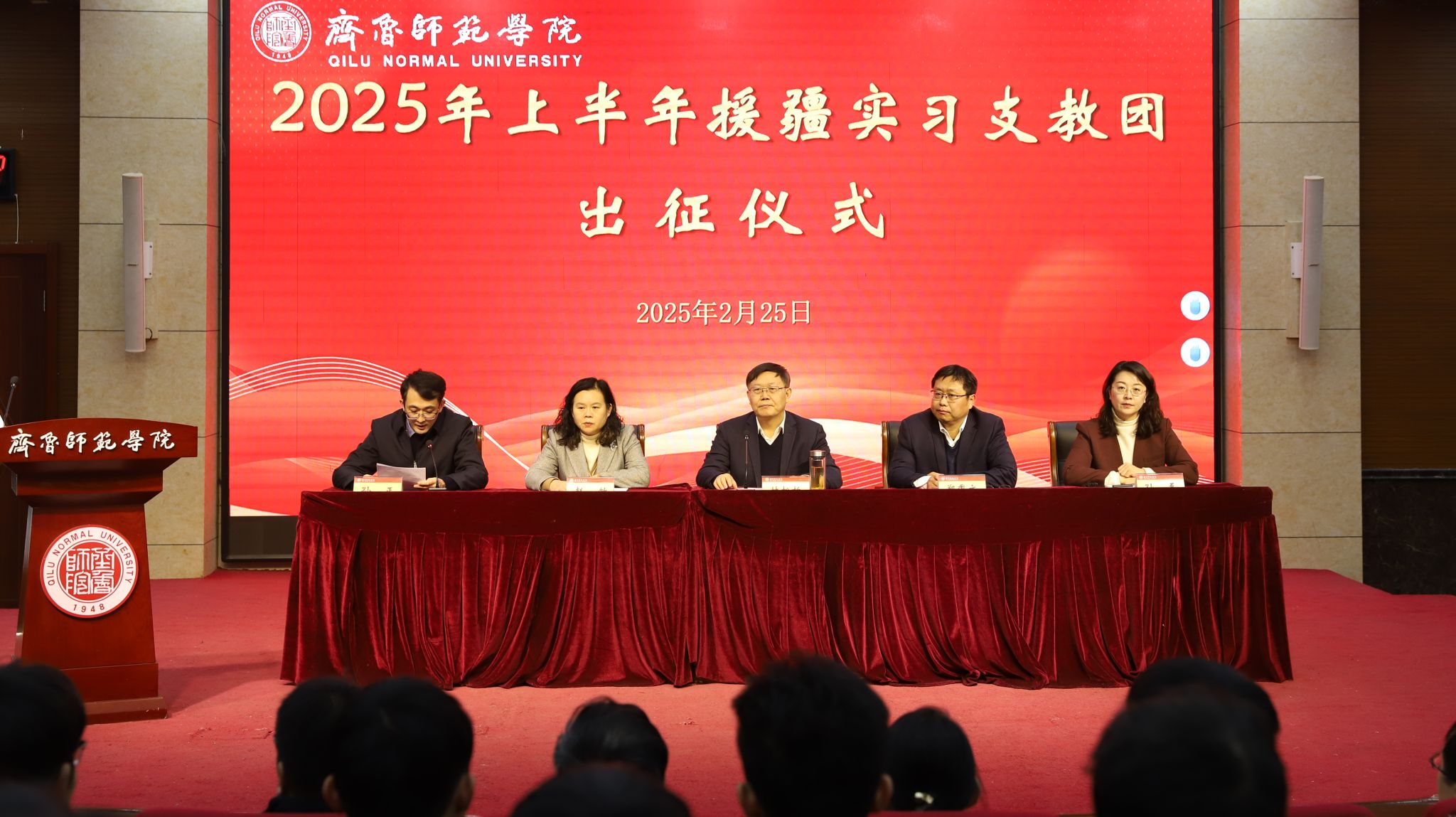 2月25日上午,BEAT365英国官网2025年上半年暨第七批援疆实习支教团出征仪式在章丘校区第一学术报告厅隆重举行。党委书记林松柏,党委副书记、校长郑秀文,党委副书记赵敏,党委委员、副校长孙正,党委委员、宣传部部长孙磊出席仪式。学生工作部、团委、教务处负责人,教师教育学院、文学与历史文化学院、音乐学院、体育学院、美术学院党政负责人,第七批援疆实习支教团全体师生参加。出征仪式由孙正主持。