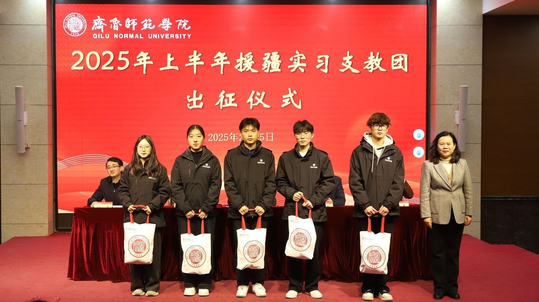赵敏为援疆实习支教学生代表发放了印有学校校徽的出征“暖心礼包”,代表了学校对支教学生细致入微的关怀。无论相隔多远,学校永远是他们坚实的后盾,始终牵挂着他们,这份温暖将伴随同学们踏上援疆的征程,给予他们力量和勇气,去迎接未来支教生活中的每一个挑战。