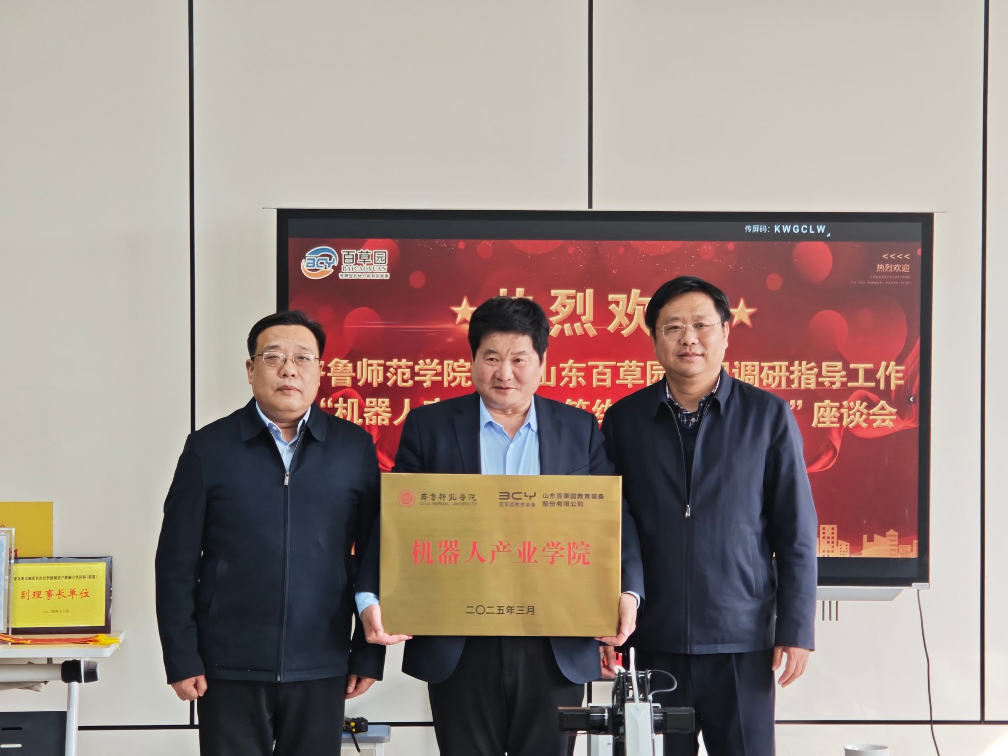 郭方华真挚感谢母校的培养与栽培,热烈欢迎郑秀文一行来公司指导考察。他介绍了自己的创业历程和公司发展情况,百草园股份公司成立于2006年,秉持“科技赋能教育,创新引领未来”的使命,专注于研发、生产和销售智能化、数字化的教学设备,是山东省工业机器人公共实训基地、山东省产教融合建设企业,近期计划投资2.6亿建设全国职业院校智能制造实训基地。他表示,此次合作坚持工业强国、教育强国的理念,致力于实现“优质项目牵引、工业过程育人”,希望校企双方共同努力,进一步深化双方长期战略合作和交流,积极推动机器人产教协同发展。