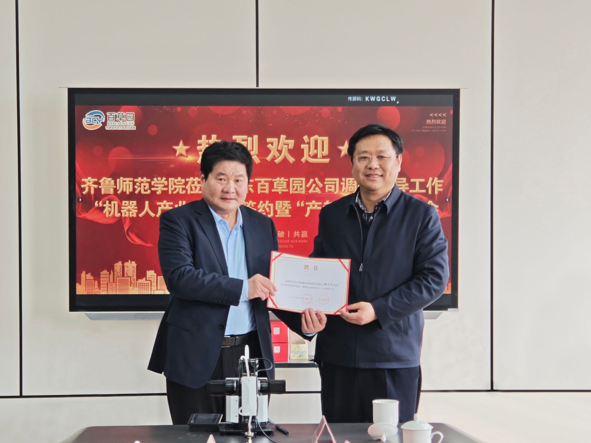 为积极拓展校企合作资源,扎实开展产教融合人才培养,3月7日,学校党委副书记、校长郑秀文带队赴山东百草园教育装备股份有限公司(以下简称百草园股份公司),组织开展“机器人产业学院”签约暨产教融合座谈会。百草园股份公司董事长郭方华、总经理魏云生,台儿庄区职业中等专业学校校长张怀志参加会议。