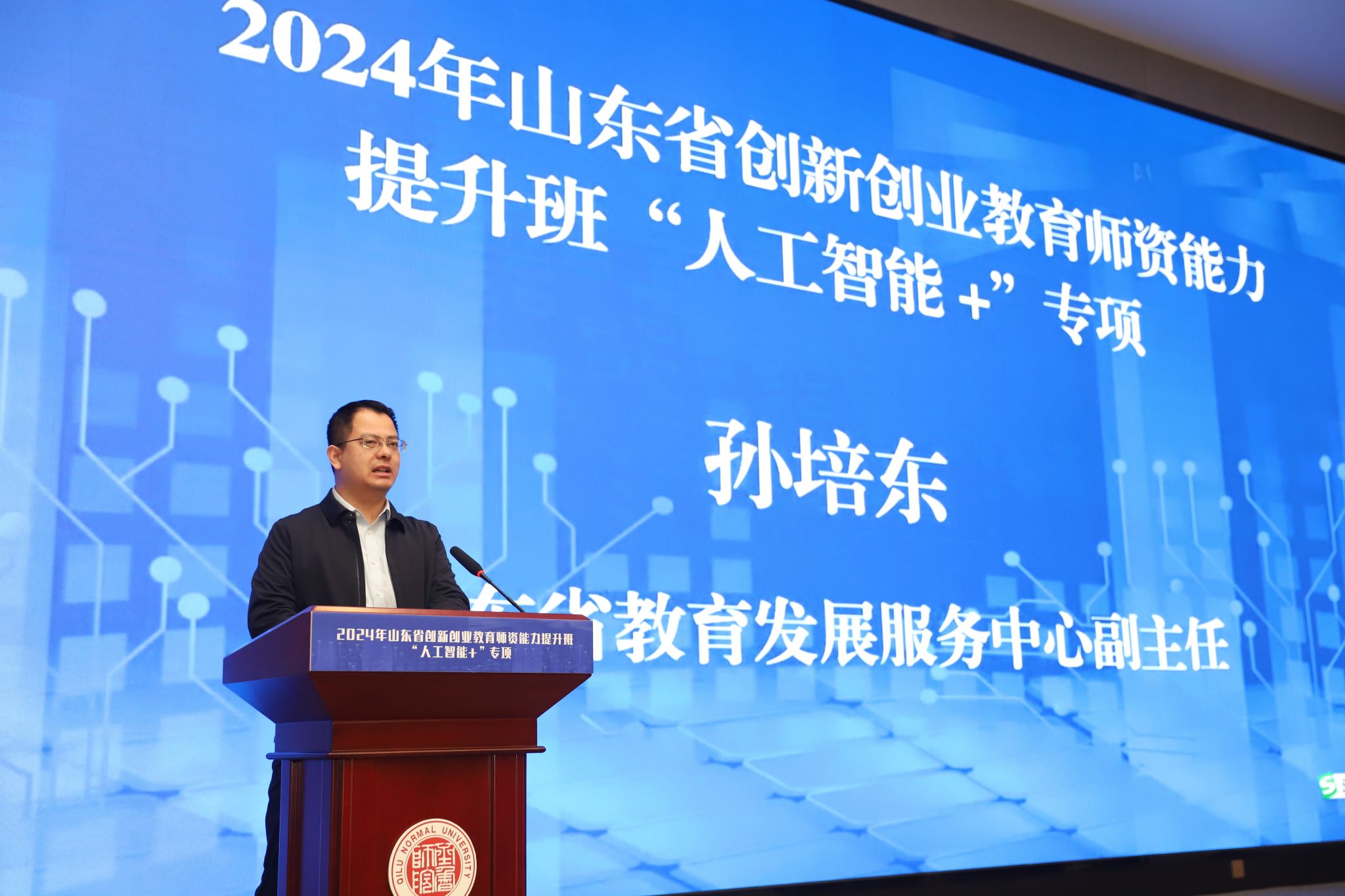 开班仪式上,孙培东代表山东省教育发展服务中心对培训班开班表示祝贺,并总结了2024年山东省高校创新创业工作取得的新成就新突破。他指出,举办此次会议是为了进一步贯彻落实国家和山东省关于创新创业教育的决策部署,聚焦人工智能这一前沿领域,着力提升我省创新创业教育师资队伍的整体素质和能力水平,推动创新创业教育与人工智能的深度融合,为培养适应新时代需求的高素质创新创业人才奠定坚实基础。他希望大家在培训期间,加强沟通交流,相互学习借鉴,分享经验成果,共同探讨创新创业教育中遇到的问题和解决策略。通过交流合作,增进了解、深化友谊,形成工作合力,共同推动我省创新创业教育事业的高质量发展。