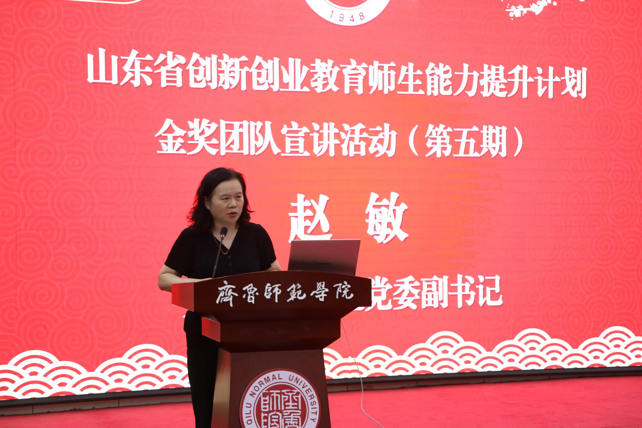 赵敏在致辞中代表学校对参加会议的各位领导、金奖团队成员致以诚挚的欢迎。她介绍了学校基本办学情况以及近年来学校在创新创业教育方面取得的成绩和积极探索。她指出,学校高度重视学生创新创业能力培养,坚持以特色创优势,以实践促创新,全方位多举措推进大学生创新创业教育。学校将以此次宣讲为契机,不断整合校内外优质资源,强化创新创业教育,坚持以赛促教、以赛促改、以赛促创,全面激活师生创新潜能,持续提升双创教育质量和层次。