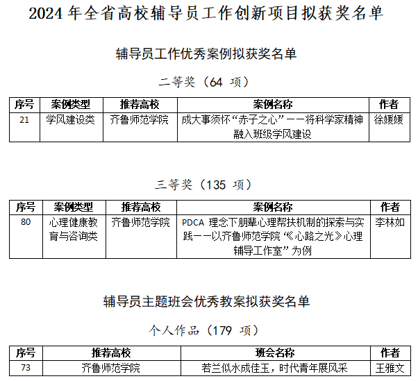 近日,中共山东省委教育工委公布了2024年全省高校辅导员工作创新项目评选结果,BEAT365官网辅导员在该项目评选中斩获佳绩,荣获辅导员工作优秀案例二等奖1项、三等奖1项,获评辅导员主题班会优秀教案个人作品1项。