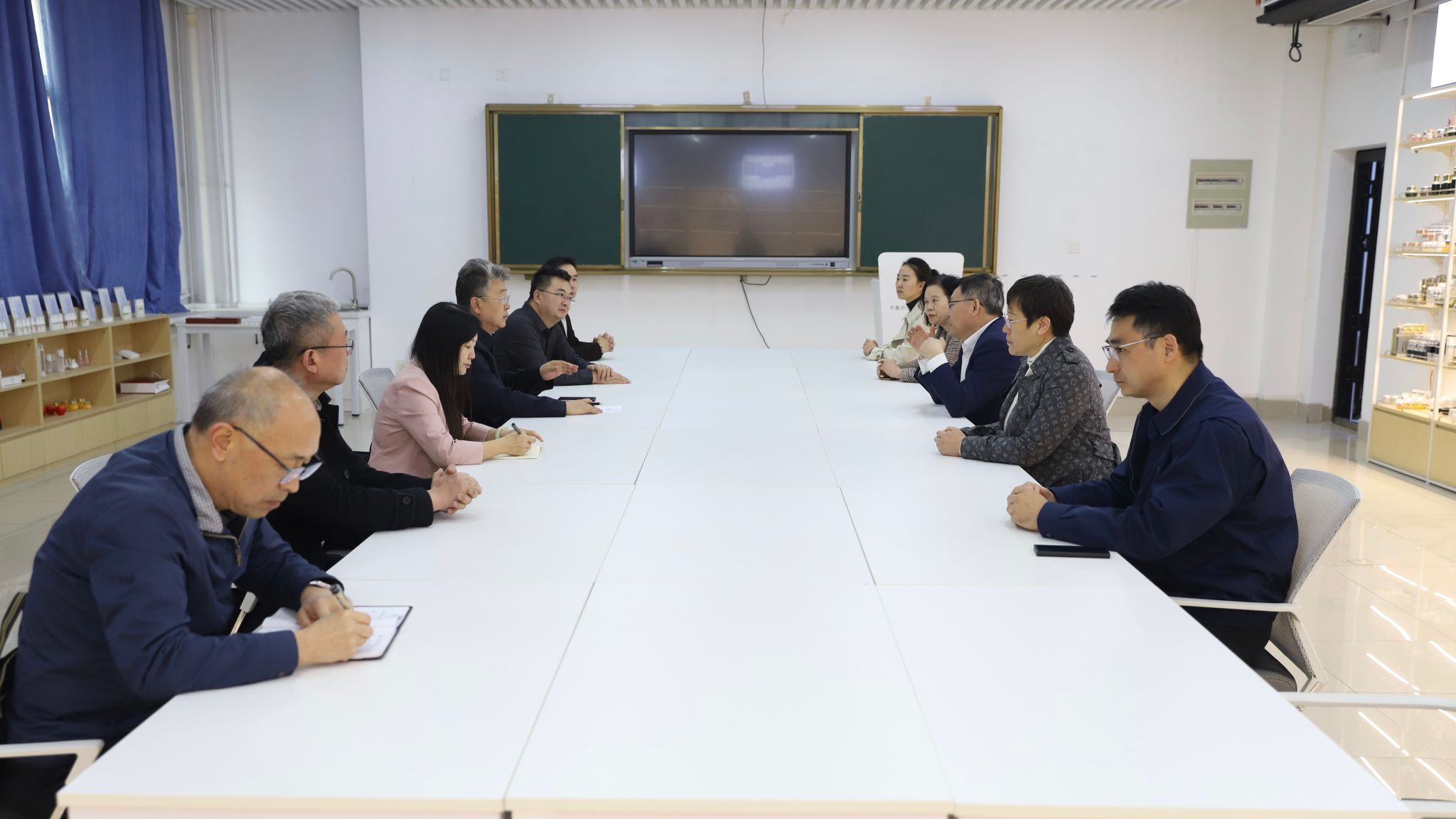 座谈会前,赵斌一行参观了齐鲁文化长廊和学校化妆品中心。
