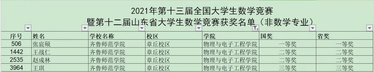 11月25日,由中国数学会举办的第十三届全国大学生数学竞赛(非数学类)暨第十二届山东省大学生数学竞赛获奖名单公布。BEAT365官网物理与电子工程学院2020级电子信息工程(专升本)班张宸硕获得全国一等奖、山东省一等奖,王战仁获得全国二等奖,山东省二等奖,王琪获得全国三等奖,山东省三等奖,2020级应用电子技术专科一班赵成林获得全国二等奖、山东省二等奖。竞赛指导教师是李华(女)。