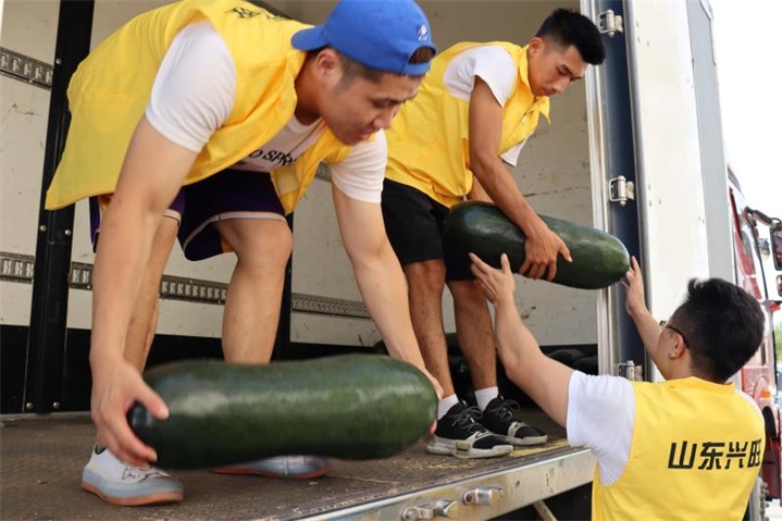 7月25日早上8时,山东省河口区兴旺体育俱乐部门前的广场上,停放着三台大型厢式货车,陈奎元等4位教练员、4名志愿者和两个司机排成了长龙,用他们的双臂组成了一条高速运转的“传动带”,一头接的是“爱心菜”堆积连片,另一头连着的是“爱心车”支援河南灾后重建。大白菜、土豆、卷心菜、洋葱、芸豆、冬瓜、方便面……一包包、一箱箱、一件件,飞速的捡,规整的码,不停的传。早晨干到了中午,地面温度节节攀升,阳光的炙烤毫无阻拦,身上的衣服早已被汗水彻底浸染。个个都在争分夺秒,没有人顾得上擦汗;腰累弯了,彼此工种换一换;胳膊酸了,用力甩一甩手接着干。人人都是主力队员,地上的货物越来越少,衣服上盐碱线却多了一圈又一圈,一直“鏖战”到中午一点,历时5个钟头的“连轴转”,人人都挑战了一把个人承受力的极限,终于把9万斤“爱心菜”全部装完。看着卡车上物资满满,心想明天凌晨就能运抵河南,他们超负荷劳动之后的疲倦,顿觉烟消云散,一张张憨憨的脸庞上写满了欣慰的笑颜。陈奎元在心中默念,赈灾有我,青春无悔,加油河南!