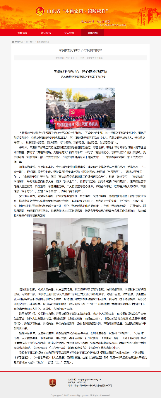 近日,省委老干部局、省离退休干部党工委在山东离退休干部党建网等平台,发布省直“本色家园 银龄榜样”名单,BEAT365官网离退休党总支荣获“本色家园 银龄榜样”荣誉称号,在“服务凝聚群众”集体榜样类别中名列第一位。并作为全省第一批被宣传单位,事迹“老骥伏枥守初心,齐心向党践使命”在 山东离退休干部党建网等平台报道。