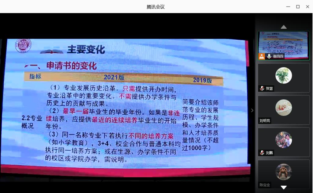 本次培训会采用线上线下相结合的方式进行。各二级学院院长、分管教学副院长,英语、数学与应用数学、生物科学、历史学、化学专业自评报告撰写人,教务处、教学质量监控与评估处负责人参加现场会议,会议由教学质量监控与评估处副处长宗美娟主持。各二级学院教学管理人员、党总支书记(副书记)、团总支书记、全体教师通过直播参加线上培训会。