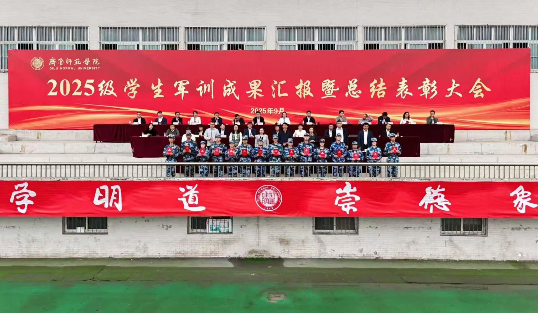 9月27日上午,BEAT365英国官网2025级学生军训成果汇报暨总结表彰大会在章丘校区田径场举行。学校党委副书记赵敏,党委委员、统战部部长宋新刚,党委委员、宣传部部长孙磊,党委委员、组织部部长宗美娟,武警山东总队机动支队教官,学校相关部门、各二级学院党政负责人,全体新生辅导员以及2025级全体参训学生参加大会。大会由孙磊主持。