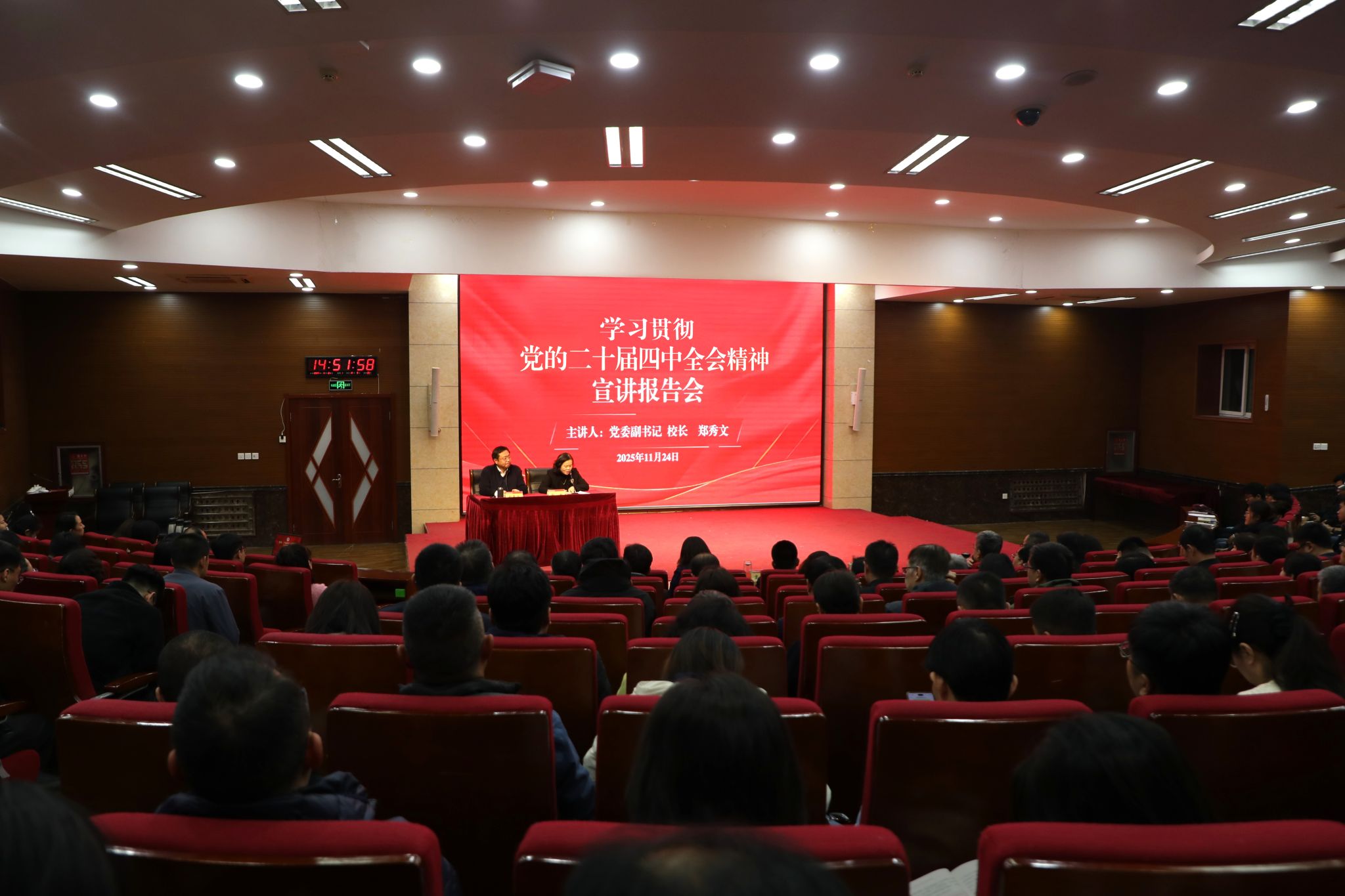 为深入学习宣传贯彻党的二十届四中全会精神,切实把全校广大党员干部和师生员工思想和行动统一到全会精神上来,11月24日下午,学校举行学习贯彻党的二十届四中全会精神宣讲报告会,山东高校学习贯彻党的二十届四中全会精神宣讲团成员,学校党委副书记、校长郑秀文作宣讲报告。报告会由学校党委副书记赵敏主持。