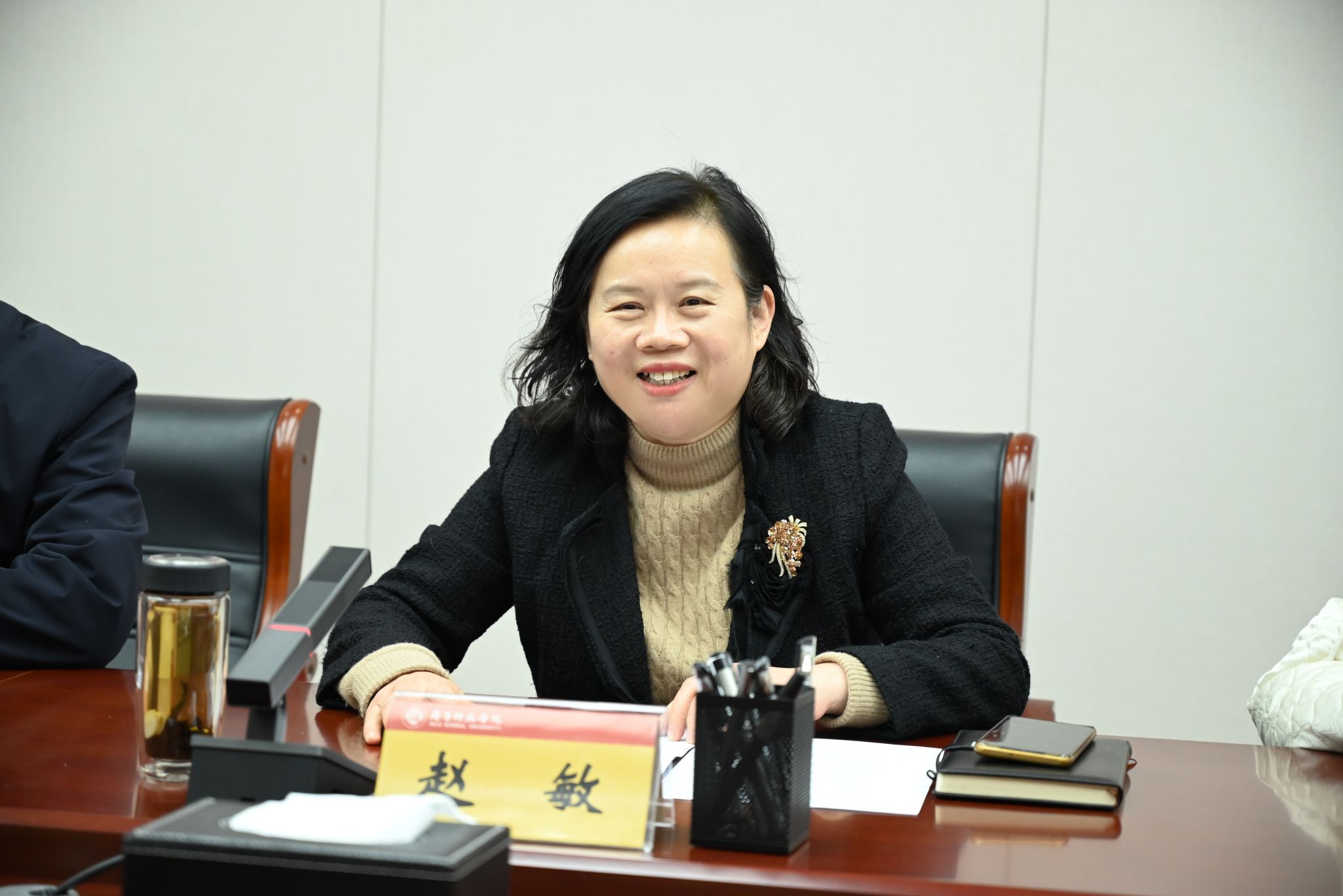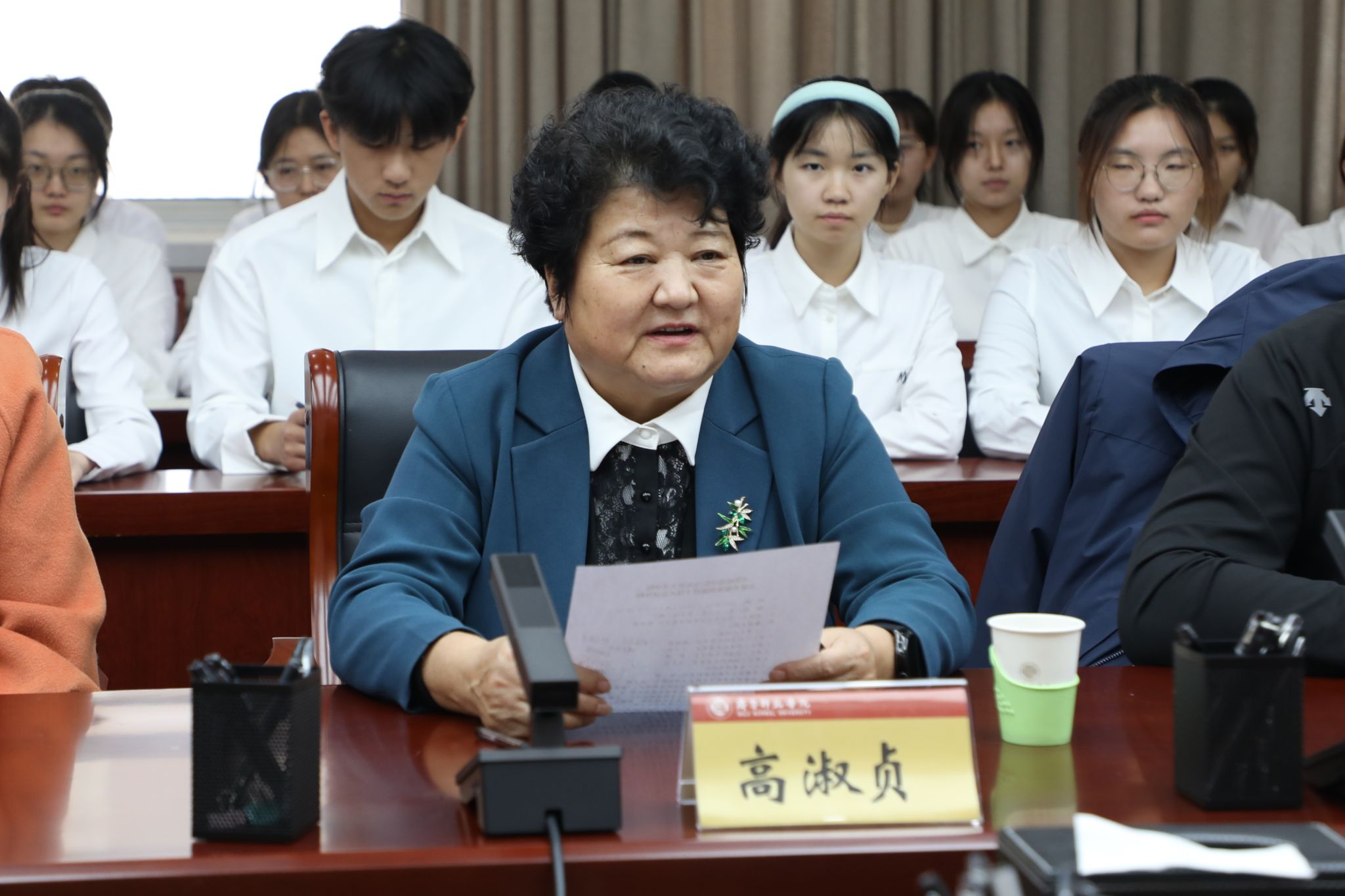 赵敏在致辞中介绍了学校的发展历程、办学特色,对此次志愿者的付出给予肯定。她指出,高淑贞书记一行赠送锦旗既是对志愿者的褒奖,更是对学校“实践育人”模式的肯定。她提出两点希望:一是希望同学们以此次经历为新起点,将志愿精神融入成长之路,深耕专业知识、夯实师范素养,主动扎根地方、服务地方;二是希望校地双方以此次合作为契机,深化党建研究、乡村思政教育、青年实践基地等领域合作,让人才培养更贴合地方需求,让青春力量助力乡村发展,共筑校地共育典范。