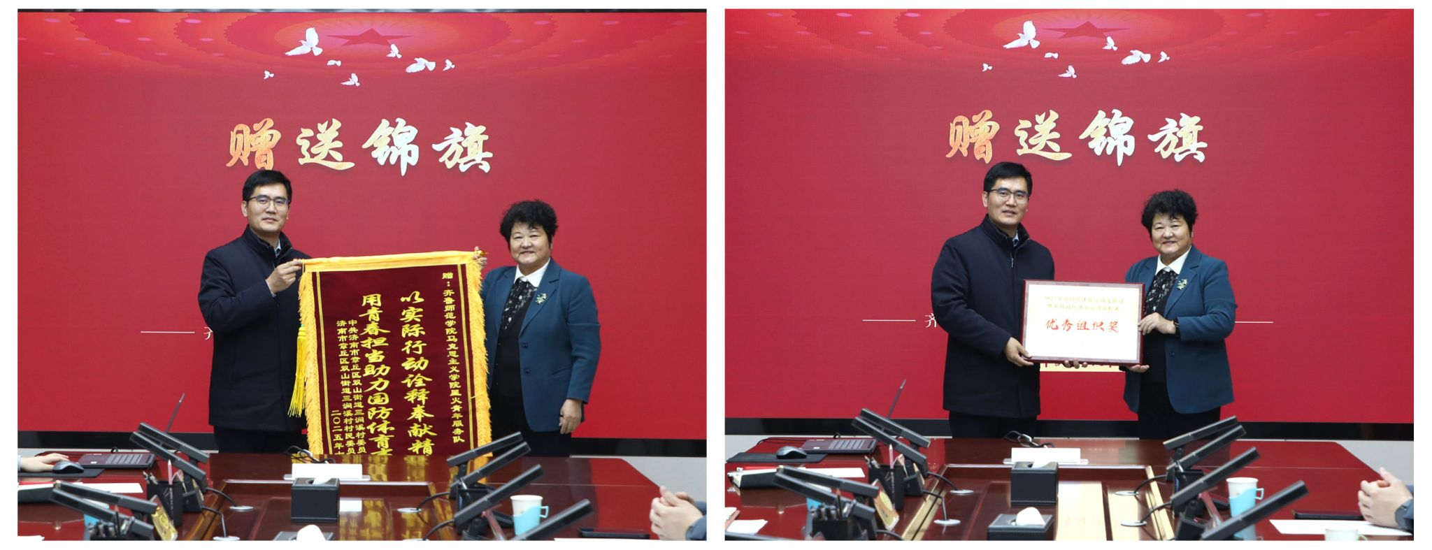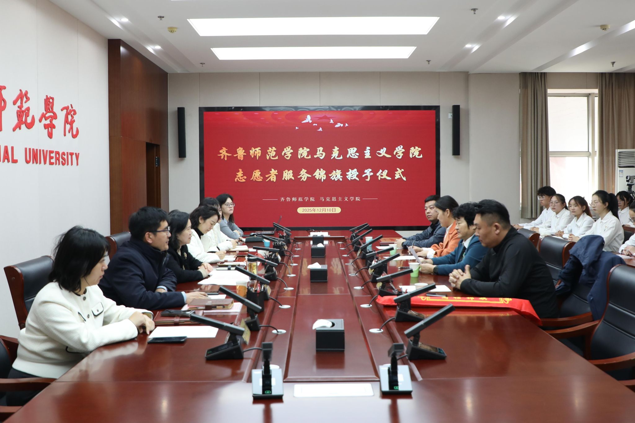 为更好贯彻落实习近平总书记致中国志愿服务联合会第三届会员代表大会的贺信精神,12月10日下午,章丘三涧溪村向马克思主义学院志愿者服务队赠送锦旗仪式在学校第二会议室举行。章丘三涧溪村党委书记高淑贞、学校党委副书记赵敏出席活动。马克思主义学院党委书记郭百灵、院长赵立峰及教师、志愿者代表参加活动。活动由郭百灵主持。