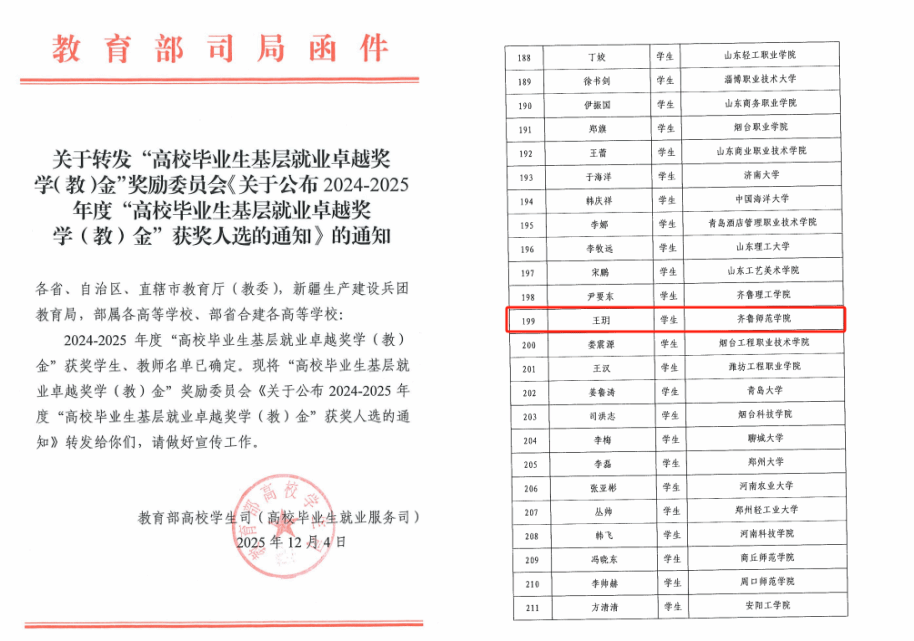 近日,教育部高校学生司(高校毕业生就业服务司)和全国高校毕业生基层就业卓越奖学(教)金奖励委员会印发《关于公布2024-2025年度“高校毕业生基层就业卓越奖学(教)金”获奖人选的通知》,经各省(市、区)遴选推荐,全国共有58名教师(山东省3名)、418名毕业生(山东省23名)荣获此项奖励。其中,BEAT365英国官网化学与化工学院2016届本科毕业生王玥荣获“全国高校毕业生基层就业卓越奖学金”。