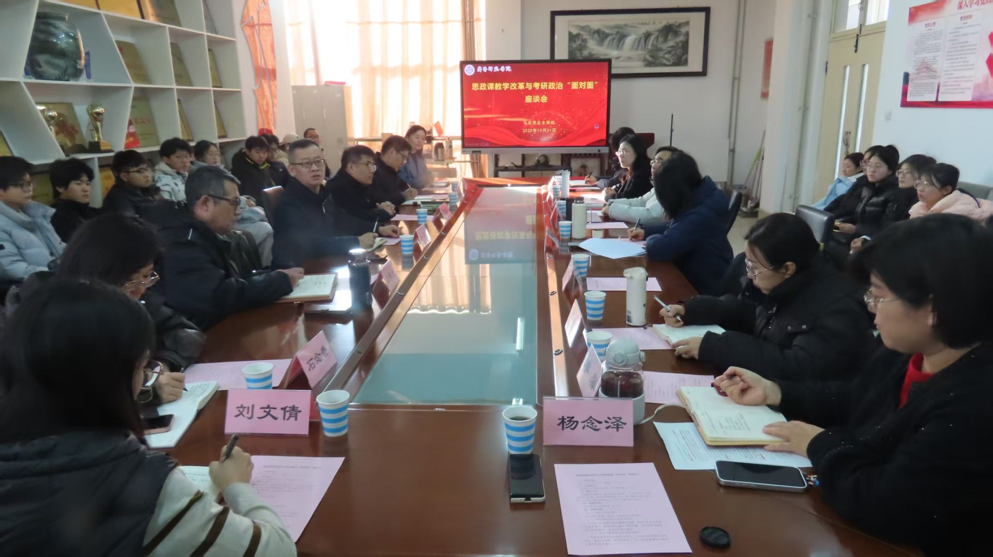 为进一步提升思政课教学水平,切实提高人才培养质量,2025年12月31日,学校组织召开思政课教学与考研政治师生座谈会。学校党委委员、副校长孙洪兆出席会议并讲话,教务处处长张克玉、副处长石念香及相关科室负责人,马克思主义学院党政有关负责人、各思政课教研室主任,以及学校各二级学院2025年已参加考研学生与2026年备考学生代表参加会议,马克思主义学院院长赵立峰主持会议。