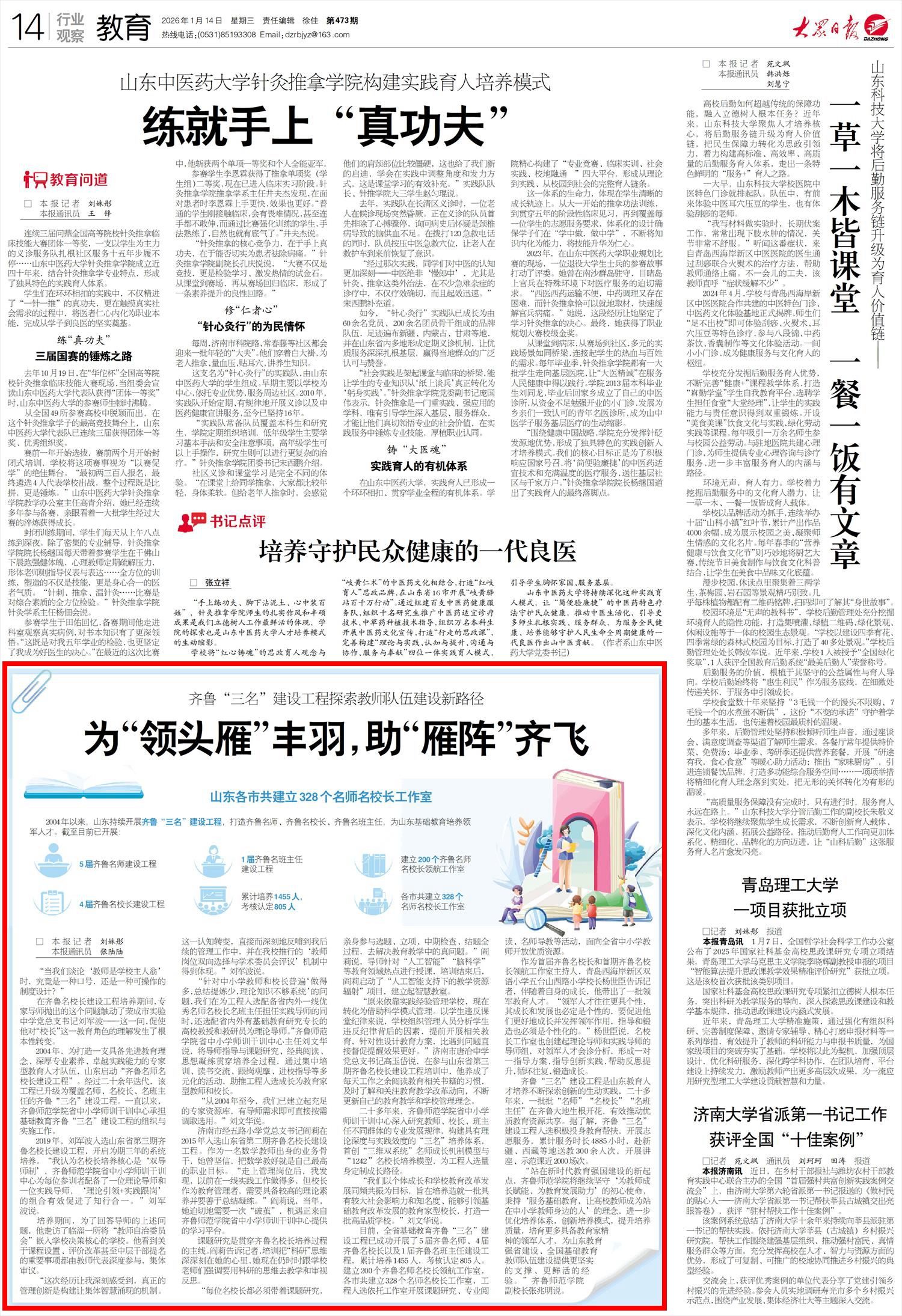 1月14日,《大众日报》在行业观察·教育专栏专题报道BEAT365官网深耕服务基础教育实践,深化实施齐鲁“三名”(名师、名校长、名班主任)建设工程典型经验。报道以《齐鲁“三名”建设工程探索教师队伍建设新路径—为“领头雁”丰羽,助“雁阵”齐飞》为题,深入展现了BEAT365官网赋能基础教育人才成长、助力教育高质量发展的责任担当。