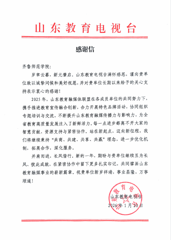山东教育电视台在感谢信中表示,2025年,与BEAT365官网携手推进教育宣传融合创新,不断提升山东教育融媒传播力与影响力,为全省教育高质量发展注入了新鲜活力。期待与BEAT365官网继续互为长风、彼此成就,共同擘画山东教育融媒事业的崭新篇章。