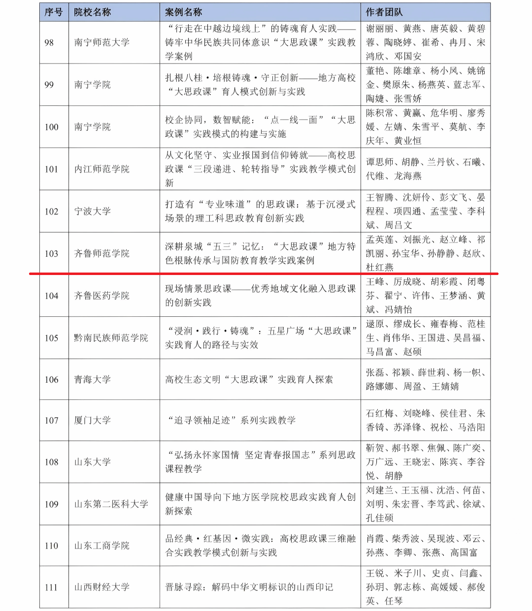本次入选案例立足山东地域文化根脉,深度挖掘泉城济南“五三”惨案历史资源,将红色记忆、地方史志与思政课实践教学深度融合,打破传统课堂边界,让思政教育从“书本”走向“现场”、从“理论”落地“实践”。通过活化地方历史资源,既让思政课堂更富有具象性、感染力,又引导学生在回望历史、铭记国殇中厚植家国情怀、强化国防观念,实现历史教育、思政教育与国防教育的有机统一。案例以创新教学理念、特色实践路径,为新时代“大思政课”实践教学提供了可复制、可推广的师范院校范本。