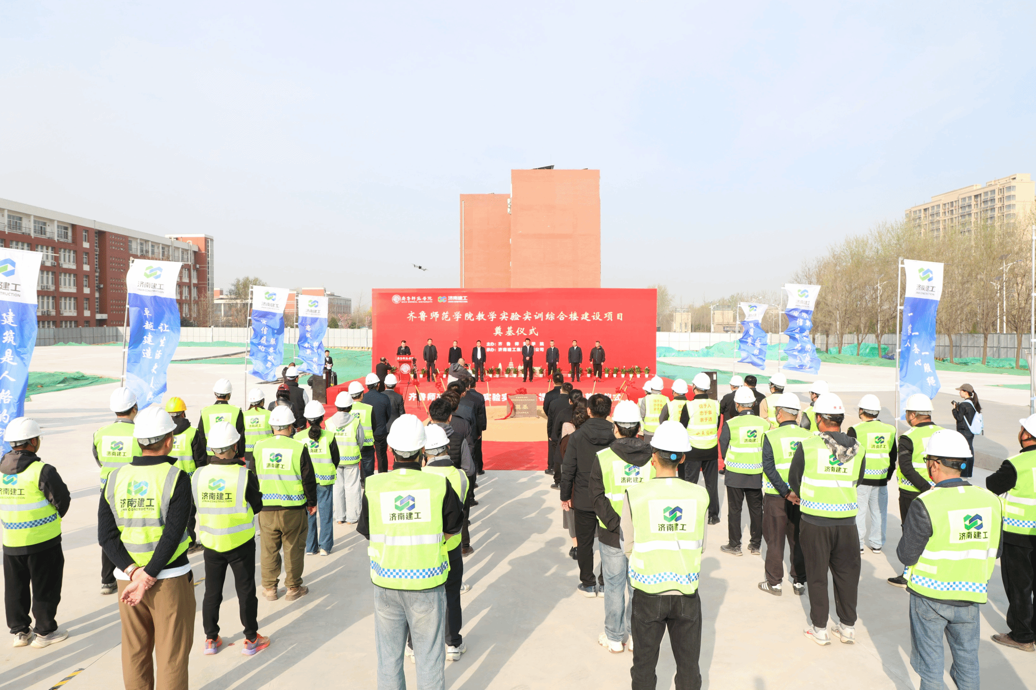 赵长林在致辞中代表学校党委向为项目筹备付出辛勤努力的全体工作人员致以诚挚的感谢,对莅临现场的各参建单位表示热烈欢迎。他指出,教学实验实训综合楼项目是学校党委行政着眼未来、统筹谋划的重点工程,对于改善实验实训条件、推动科研创新、提升应用型创新人才培养能力、增强学校核心竞争力,努力创建“双优”应用型本科高校和国家教师教育能力提升工程建设高校具有十分重要而深远的意义。他提出三点要求:一是坚守质量底线,打造精品工程始终坚持高标准、严要求,基建、审计、实验管理等部门负责人要分组全过程监督工程质量,监理公司要严格履行监理责任,和施工单位一起严把工程质量关、材料关、工艺关,精雕细琢、精益求精,努力把教学实验实训综合楼项目建设成为经得起历史检验、经得起师生检验的优质工程、示范工程。二是严守安全红线,打造高效工程。时刻紧绷安全生产这根弦,严格落实安全生产责任制,规范施工管理,强化风险防控,做到安全施工、文明施工、绿色施工,确保项目建设全过程平安有序。三是严控建设进度,打造高效工程。科学组织施工,统筹协调推进,在保证质量和安全的前提下,按期高效完成各项建设任务,力争项目早日竣工、早日投用、早日惠及师生。