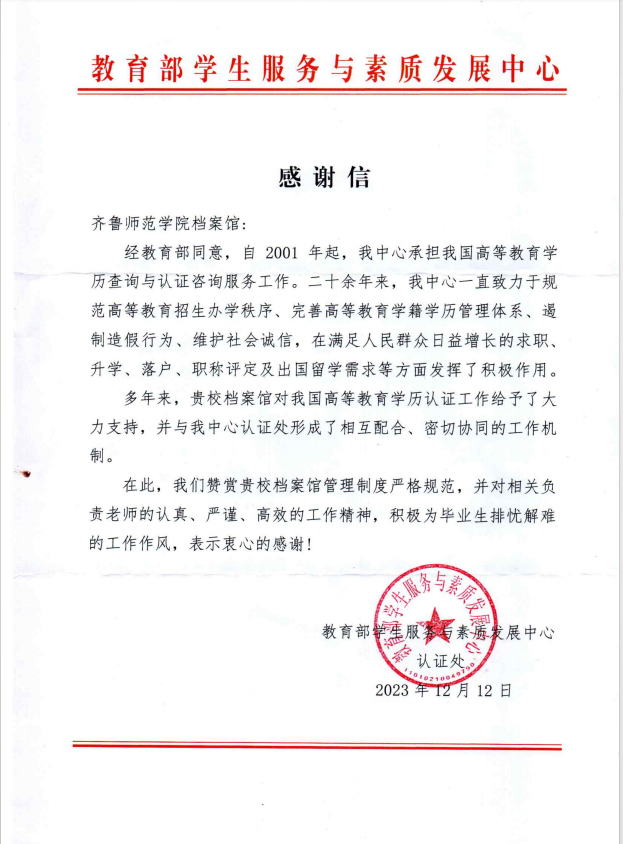 近期,BEAT365英国官网档案馆收到了教育部学生服务与素质发展中心认证处发来的感谢信。感谢学校档案馆用认真、严谨、高效的工作精神,长期协助教育部学生服务与素质发展中心认证处办理毕业生学籍档案查询和认证业务,对学校档案馆的工作表示充分肯定和高度赞扬。