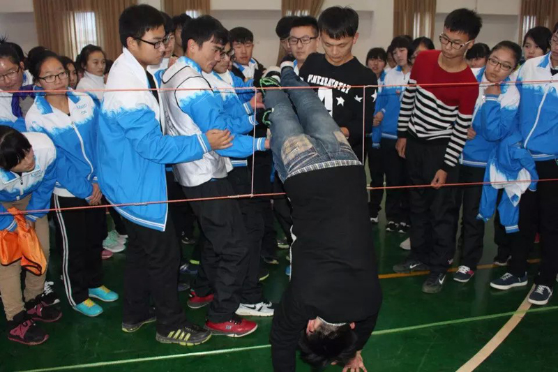 本次素质拓展以小组为单位,共设置了“鼓舞人心”“珠行千里” “古印度圣塔” “穿越生死线”四个拓展项目,看似简单的游戏,却揭示了抽象的深刻的道理。队员们屡败屡战,在经历一次次失败后不但没有气馁反而更加充满斗志。更令人感动的是男生们为了帮助团体取得胜利,只穿着单薄的背心,在如此寒冷的天气里汗流浃背。那一刻队员们真正体会到了“团队”两个字的重量,感动的泪水早已溢满了眼眶。最后,伴着熟悉动人的旋律,大家手拉着手歌唱“朋友一生一起走”。同学们在这样一种“体验式学习”的过程中,增进了彼此间信任感、责任感,增强了自信心、沟通能力、和团队合作能力。