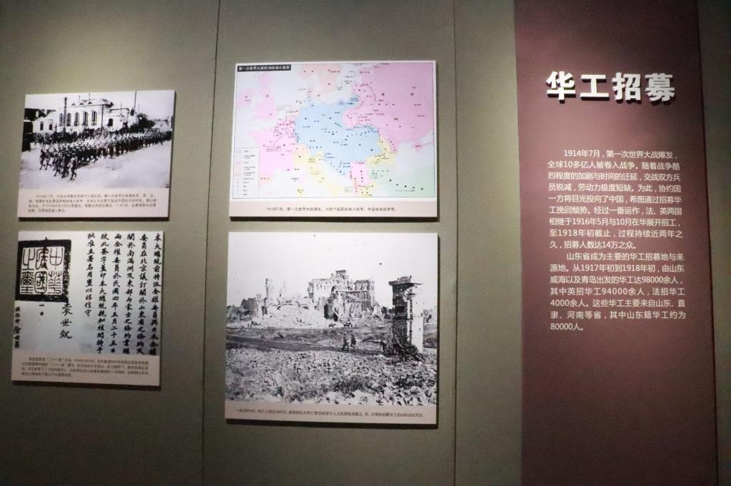 其中,五号展厅与其他展厅的内容大不相同。五号展厅是第一次世界大战华工史料图片展,通过当时存留下的书信和图片可看出一战时中国持续大量地向西方国家输出劳动力,从而导致中国人口急剧减少。黑白色彩的照片上印着一个个参战人员的无奈与心酸,也让团员们意识到我们现有的和平来之不易。