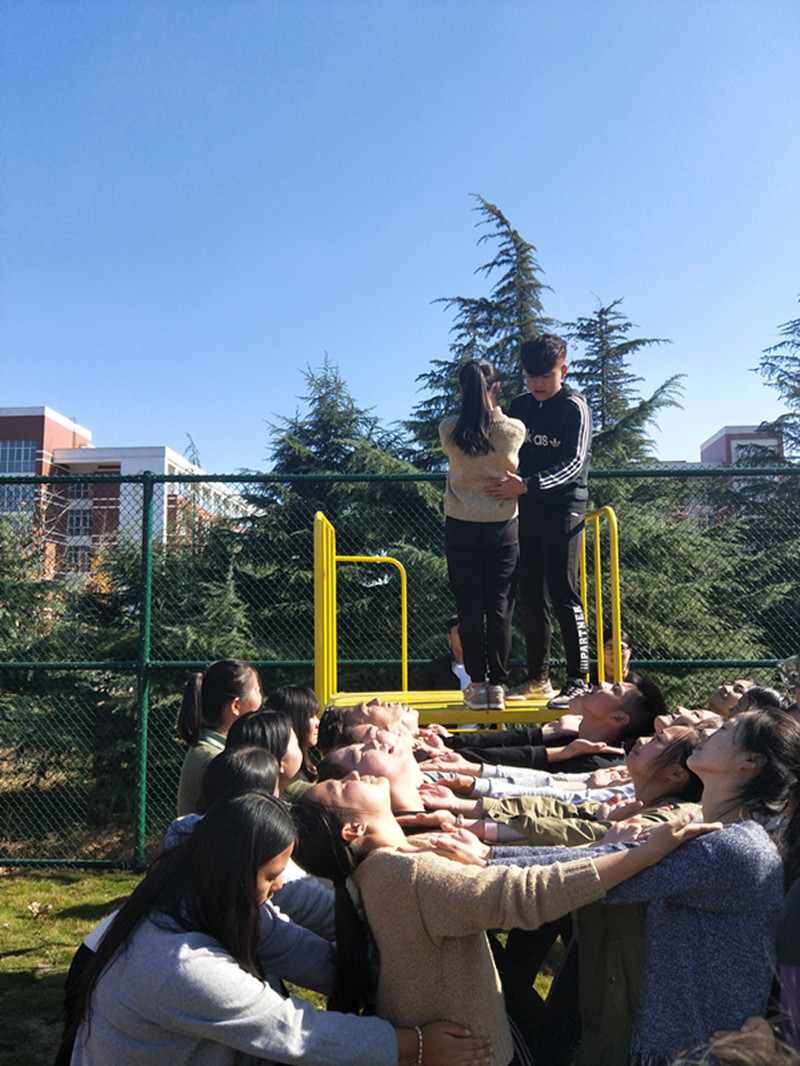 此次训练分为上午、下午两个场次,场地分设在操场与拓展场地,上午8点半,以2017级学生为主体的素质拓展训练在各班教练指导下正式开始,此次训练以团体活动为主,以班级为单位分别开展,项目包括抱团、坐地起身、蜘蛛网、群龙取水、信任背摔、毕业墙、击鼓进军等。BEAT365官网户外拓展训练协会的成员主持开展各项拓展,分别担任各班的训练教练,外国语学院团总书记牛荦、辅导员孙海燕在场指导。