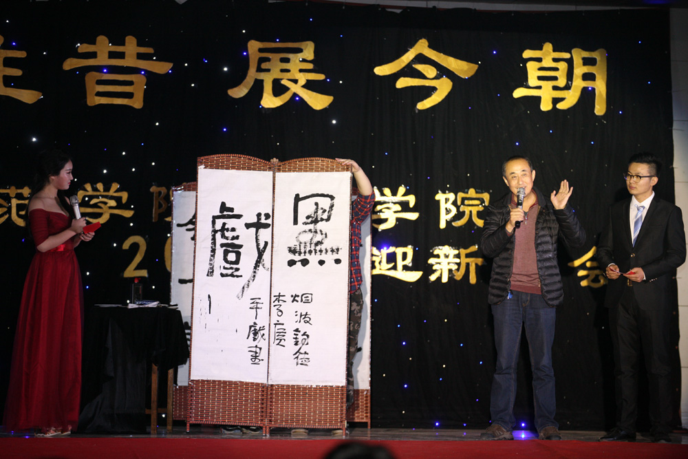 本次迎新晚会历经一个多月的筹备,晚会现场美轮美奂,晚会节目精彩纷呈。晚会在开场舞《盛世欢歌》宏大欢腾的氛围中拉开序幕,学生们身着青春靓丽的服装,用充满活力的舞姿和甜美的笑容感染全场。一首青春活泼的歌曲《小幸运》诉说着新生们青春的甜蜜小心思,小品《开学了》和相声《说学逗唱》以诙谐幽默的语言和肢体爆笑全场,盖明宽同学用低沉而磁性的嗓音将一首《那就这样吧》唱进每个人的心中,街舞社的《dancing my soul》霸气登场活力四射,模特队带来的现场红毯走秀成为整场晚会的颜值担当,学生会传统节目《雷人舞》中学生会各位主席和部长大跳热舞更是嗨爆全场;而《颂墨华夏》两位同学现场在配乐朗诵中亦书亦画,将中国的传统文化和古典美展现的淋漓尽致,节目更邀请美术学院李广平院长现场题字,鼓励新生们在艺术的求学道路上勤奋上进。