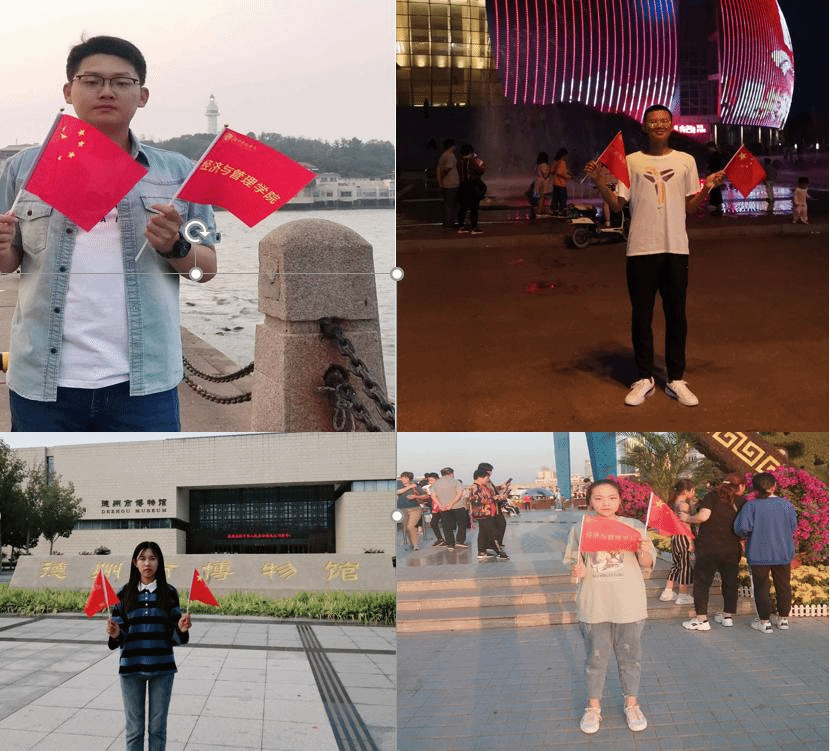 10月3日,山东省各市经管学子手持国旗以及带有经济与管理学院字样的红旗,来到当地的标志性地点,通过照片和视频的形式向祖国发来生日祝福。“我在家乡济南祝祖国生日快乐,祝祖国繁荣昌盛”、“我在青岛祝祖国生日快乐,七十年风雨兼程,七十年披荆斩棘,愿我的祖国母亲青春常驻,繁荣昌盛”、“我在我的家乡聊城,祝我的祖国70周年生日快乐,感慨祖国70年巨变,我为我的祖国而骄傲,来世还做华夏人”…一张张稚嫩的脸庞,一声声真挚的祝福,字里行间无一不展现着经管学子对祖国的热爱!