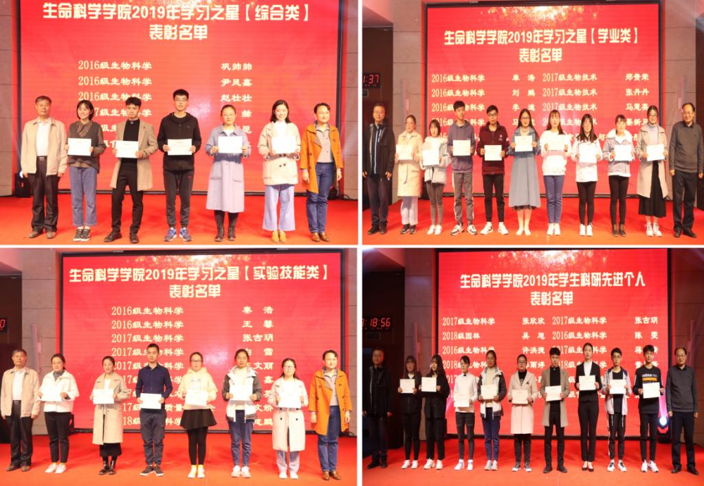 为表彰先进,弘扬正气,树立榜样,凝聚力量,充分发挥先进典型的示范引领作用,晚会上,还隆重表彰了在科研、外语、学业、文体、创新创业等方面的先进学生,共有近百名学生获得生命科学学院2018-2019学年度科研先进个人奖、学习之星【外语类】、学习之星【学业类】、学习之星【文体类】、学习之星【实验技能类】、学习之星【师范技能类】、学习之星【创新创业类】、学习之星【综合类】的光荣称号并上台领奖。