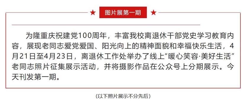 “暖心笑容、美好生活”老同志线上照片展将陆续在离退休工作处微信公众号刊登。