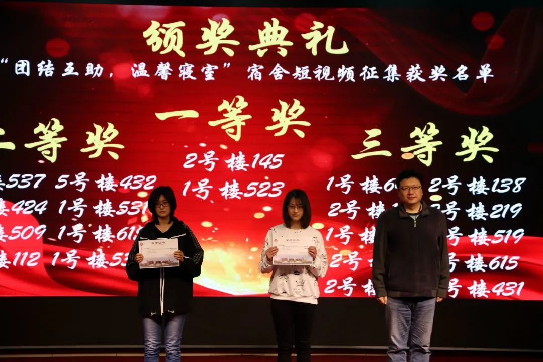 此后,颁奖典礼正式开始。阴小建、万丽丽、孙建凯为获奖宿舍及个人颁发奖项,并对获奖同学表达了由衷的祝贺。