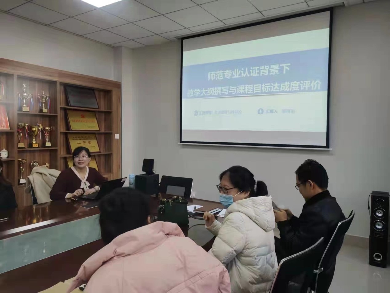董苗苗以“师范专业认证背景下教学大纲、课程目标达成度评价”为题,结合自身经历与体会,分享了教学大纲、课程目标的多种评价考核方式的思路与经验,让与会人员深受启发。研讨会上,师范认证小组的成员分别就各自工作进展与存在问题进行了交流与研讨,通过研讨交流,并就有关问题进行咨询,进一步深化了标准意识,查找到前期准备工作的短板与差距,进而明确了目标和发力点,为提升师范认证工作起到良好的推动作用。