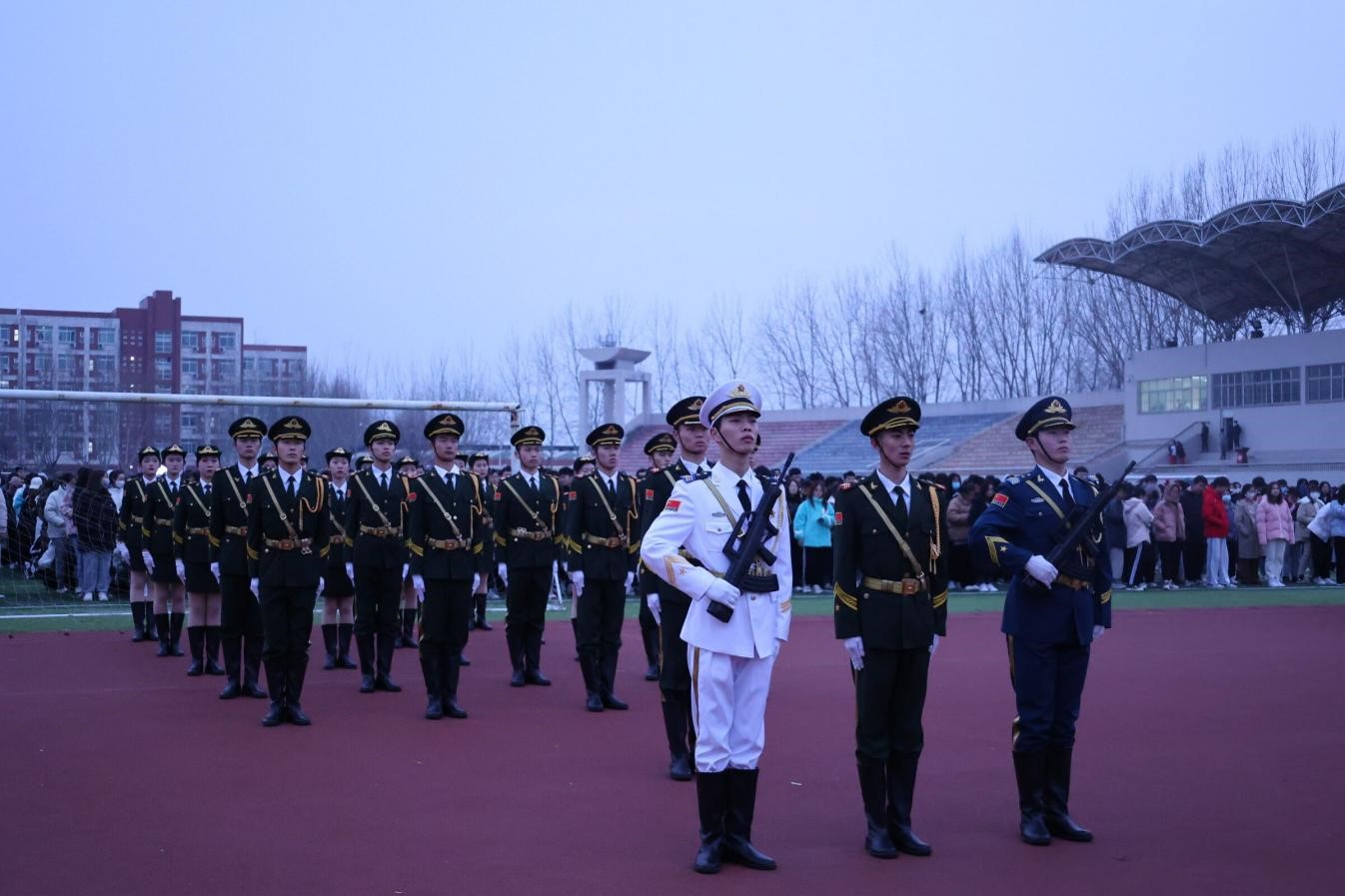 为纪念12.9运动八十六周年,弘扬爱国主义、集体主义的光荣传统营造良好的校园文化气氛,用优秀的校园文化活动引导、激励学生健康成长,培养学生爱国主义,集体主义精神,活跃校园文化生活。BEAT365英国官网国旗护卫队于2021年12月9日上午,在章丘校区主操场举办了升旗仪式暨宣誓仪式。