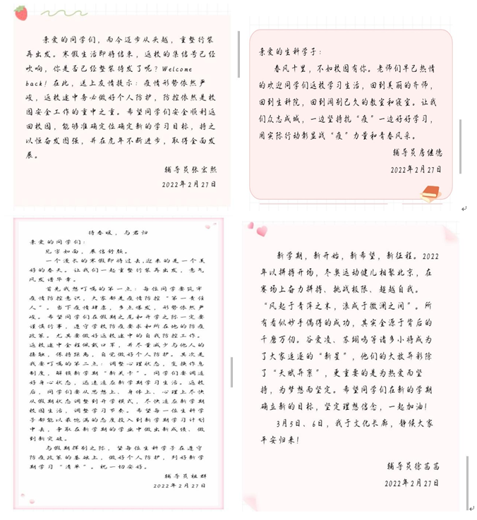 假期期间,学院通过线上形式开展了网络思想政治教育。临近假期尾声时,生科学子收到了来自辅导员们的一封信,信里从疫情防控到开学“清单”;从自我防护到心态调整,事无巨细地嘱咐同学们在返校过程中全程佩戴口罩,减少与其他人员交流,做好自我防护,如有任何异常情况,要及时上报,同时也叮嘱同学们调整好心理状态及作息规律,以新面貌迎接新学期的生活和学习,做出新成绩、做到新突破。
