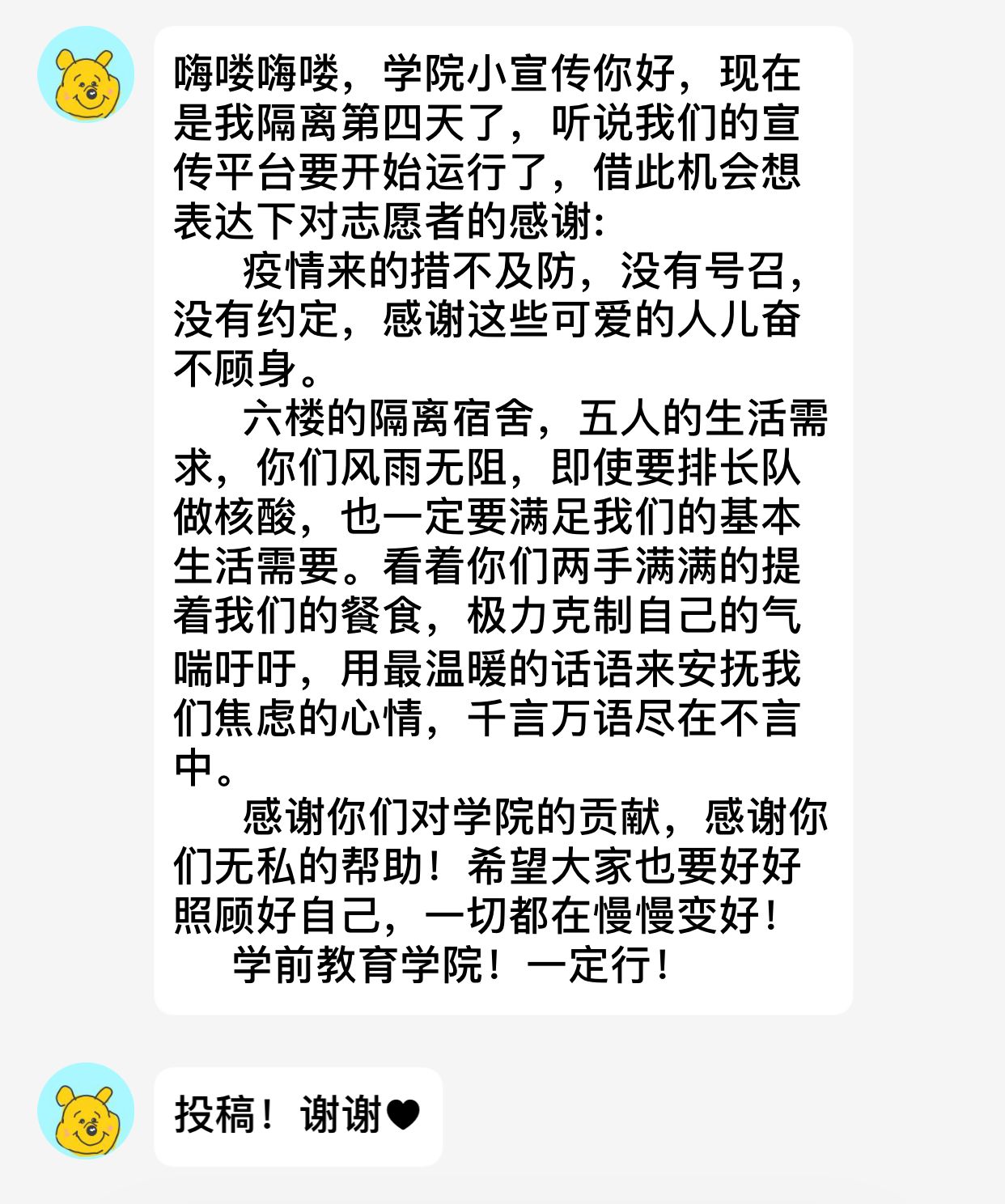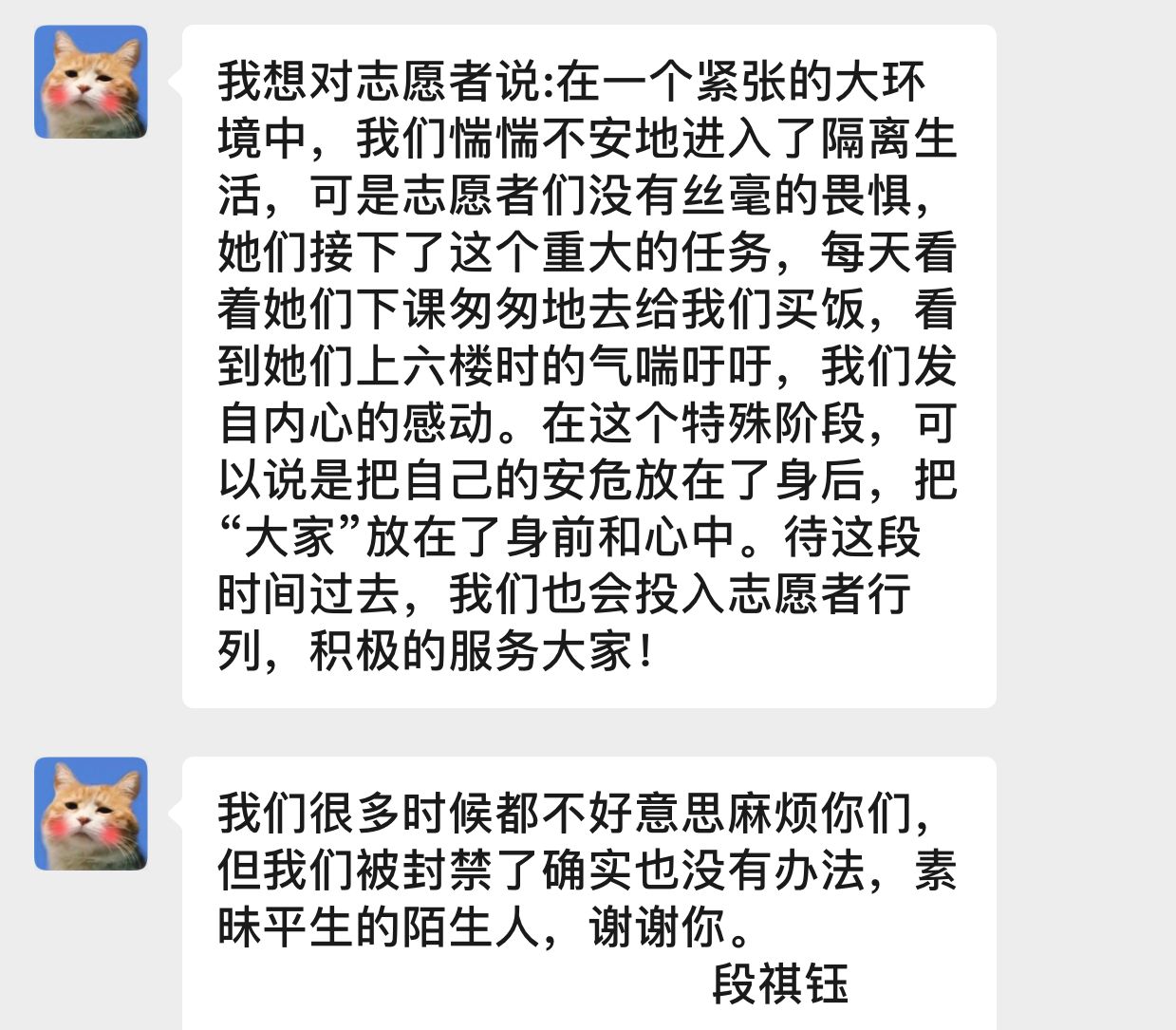 “老师,同学,你们辛苦了!”“老师,同学,你们也注意休息!”“老师,同学,有你们真好!”……这些话语来自学生的支持与肯定,也是学院师生共同做好防控工作的最大动力。辅导员、志愿者无私的付出和隔离人员温暖的话语,便是大爱,情暖你我。