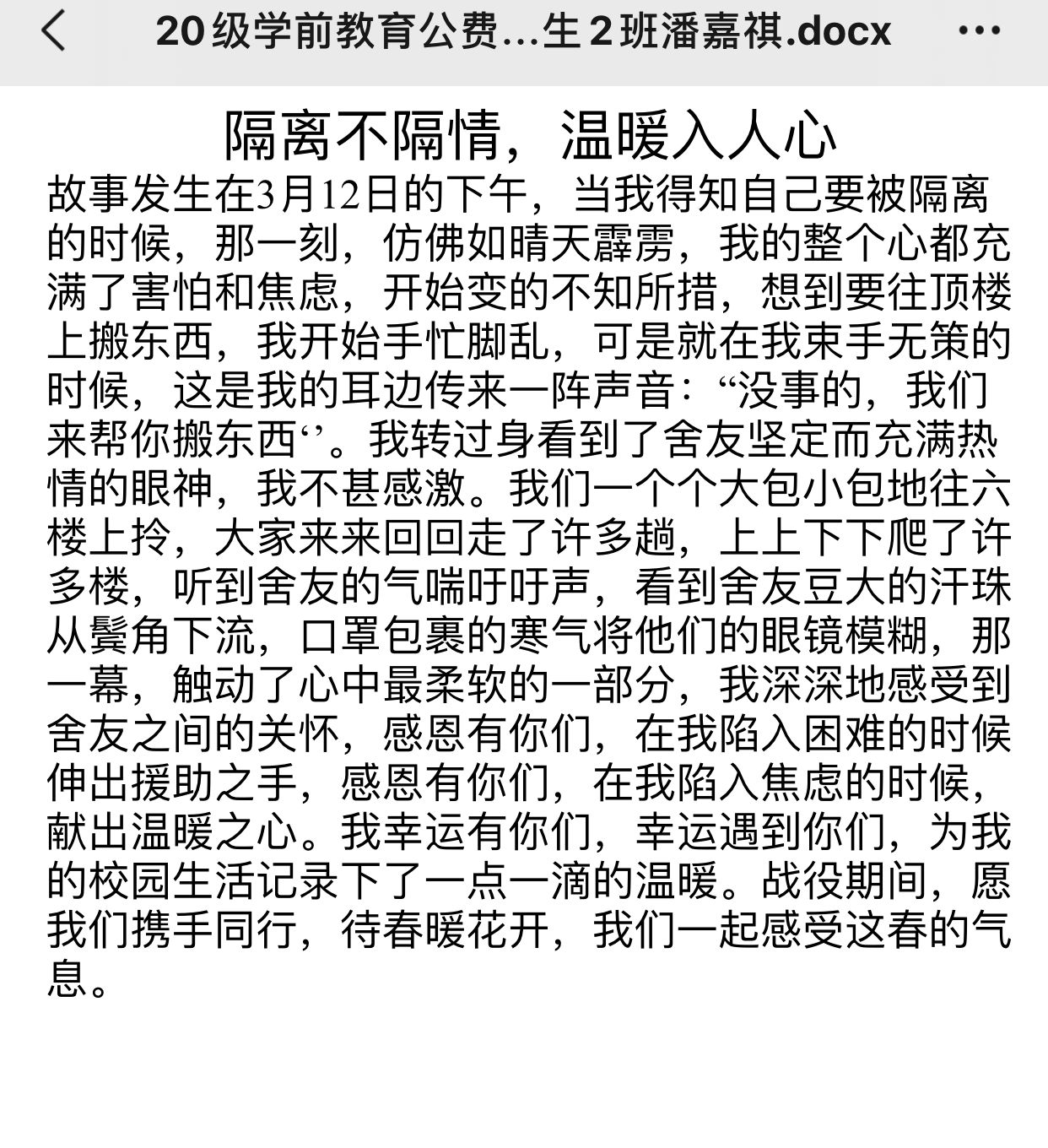 学前教育学院共有学生2222人,人数多,且学生各类状况复杂,返校学生、非疫情发生地的同学因教师资格证考试离校、因走读居家、隔离学生,这些都为现有条件下的防控工作带来了极大挑战。各项任务通知的落实、各种类型学生的筛查、学生各类信息的统计、各种数据表格的报送、各类型学生的核检,挡不住的电波、飞速传递的表格、疾驰的脚步、忙碌的身影......全体辅导员勇担重任,上下同心,全力以赴,好似一群斗志昂扬的战士,用勇气、责任、耐心、爱心,铸成了一道道钢铁屏障,守护学生,照亮前路!
