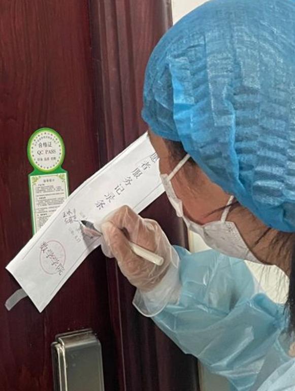 由于数学学院众多隔离宿舍分布在各个宿舍楼,为了确保被隔离学生严格按照疫情防控要求进行隔离观察,避免学生外出流动,学院设计了“志愿者服务记录条”,粘贴在各个隔离宿舍的门上,加强对隔离学生的管理的同时记录志愿者每次服务情况。