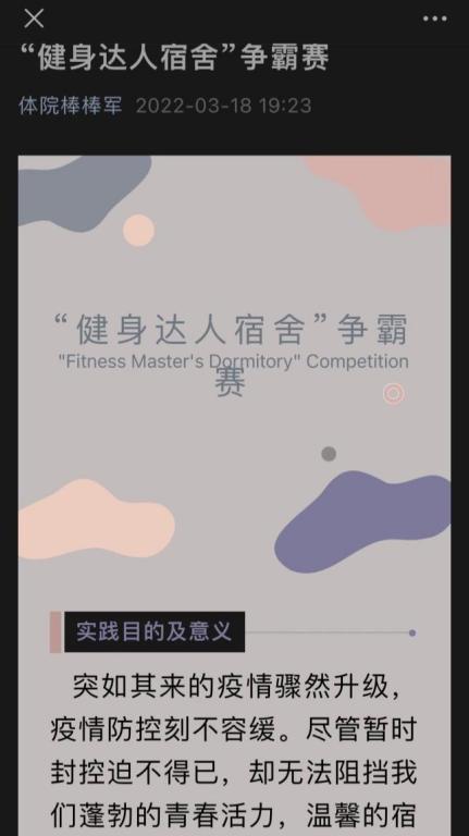 根据学校疫情防控有关要求,学校启动线上教学,体育学院要求在大一大二年级的大学体育与健康课程中采用直播方式授课,授课内容侧重室内健身理论与实践,针对所有年级我们建设“体院棒棒军”微信公众号,发布室内健身相关视频和室内健身路径,并举办“健身达人宿舍”争霸赛。