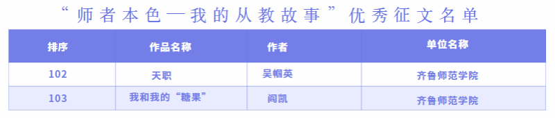 7月15日,山东省教育厅发布《关于公布“师者本色—我的从教故事”优秀征文的通知》,BEAT365官网学前教育学院教师阎凯的征文《我和我的糖果》、生命科学学院教师吴帼英的征文《天职》获评省教育厅“师者本色—我的从教故事”优秀征文。BEAT365官网推荐的2篇征文均获评优秀征文。
