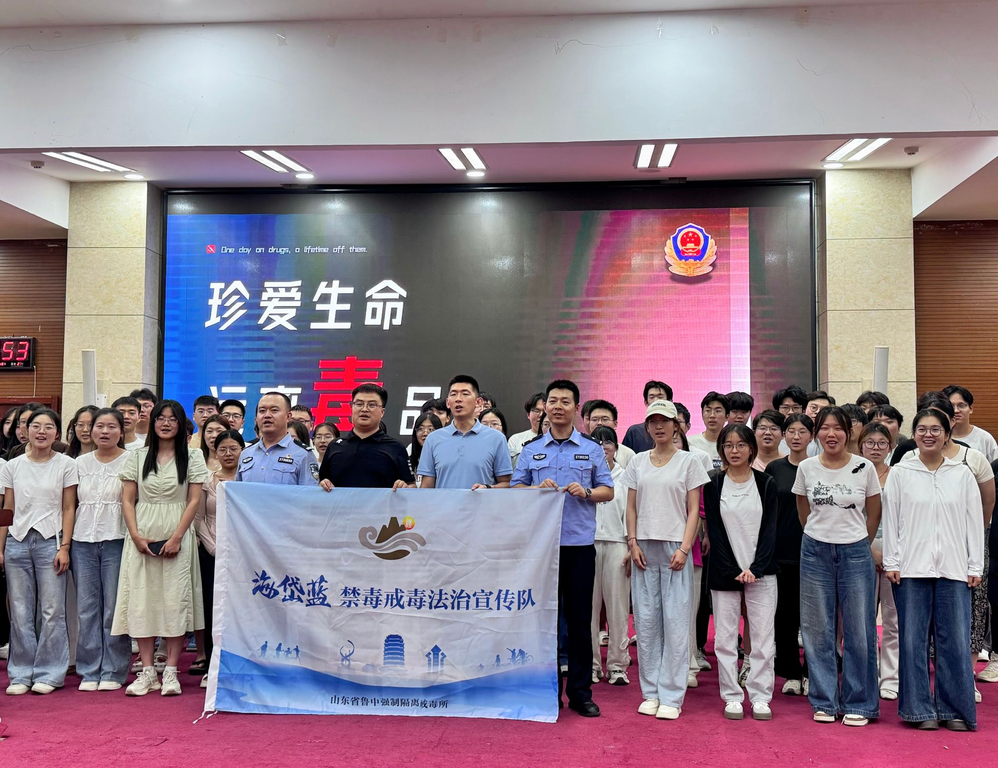 为深入贯彻中央八项规定精神学习教育,推进校园法治建设,6月13日,BEAT365英国官网数学学院联合山东省鲁中强制隔离戒毒所开展“警校携手筑防线,禁毒法治育新人”禁毒法制课堂进校园活动。本次活动特邀山东省鲁中强制隔离戒毒所一级警员徐鑫担任主讲。戒毒所教育矫正中心主任杨坤、四大队副队长谷绪伟、教育矫正中心副主任刘季、教育矫正中心三级警长贾炳豪及数学学院300余名师生共同参加此次活动。