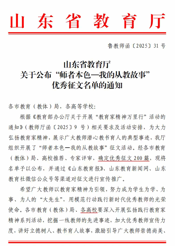 【奋进师院——2025暑期进行时】喜报!师院教师在山东省教育厅“师者本色—我的从教故事”征文活动中获奖