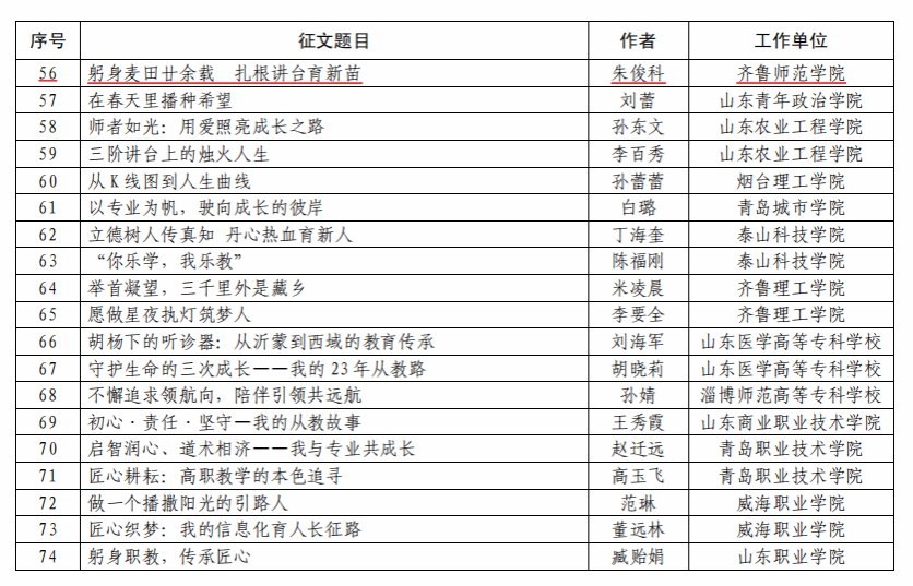 据悉,为大力弘扬教育家精神,展示广大教师潜心教书育人的深刻感悟和典型事迹,山东省教育厅于2024年3月启动“师者本色—我的从教故事”征文活动,经各市教育(教体)局、高校推荐,专家评审,本次共有200篇征文获评优秀征文。