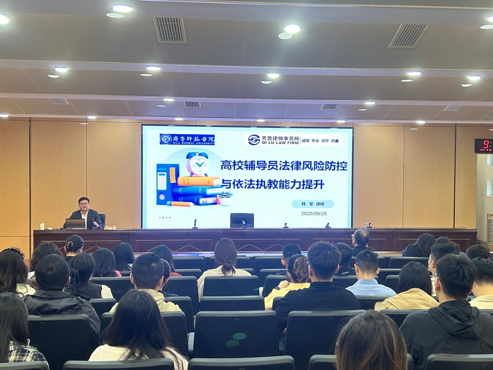 9月25日上午,学校在章丘校区第二学术报告厅举办2025年第三期辅导员工作沙龙,活动邀请山东齐鲁律师事务所副主任、党委副书记韩军律师作《高校辅导员法律风险防控与依法执教能力提升》专题报告。学生工作部(处)负责同志,各学院党委副书记、辅导员参加沙龙活动。活动由学生工作部(处)部长李玮主持。