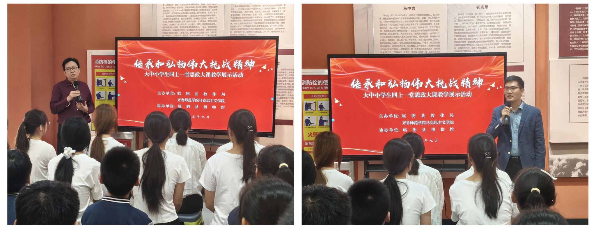 课堂一改传统教室授课模式,将讲台移至充满历史厚重感的博物馆展厅。在革命文物、历史图片与复原场景的环绕中,师生共同感受历史的脉搏,为课程营造出庄重而深刻的氛围。临朐县第二实验小学陈蓓蓓老师以《触摸红色记忆,致敬革命先辈》为题,组织小学生开展微话剧表演,通过角色扮演引导孩子们了解英雄事迹,缅怀革命先烈。临朐县龙泉中学程琦老师以《探寻革命足迹,感悟引领力量》为题,借助展板文字与革命文物,系统讲解临朐县抗战历史脉络,并组织初中生模拟抗战时期党组织会议,深化对伟大抗战精神内涵的理解。临朐县实验中学杨春艳老师以《深悟革命精神,勇担时代使命》为题,运用AI合成视频、主题演讲等方式,展现伟大抗战精神在当代临朐乡村振兴与社会治理中的生动体现,激励高中生将个人理想融入国家发展。马克思主义学院孙宝华教授则从理论高度阐释伟大抗战精神的时代价值,号召青年学生将精神滋养转化为担当民族复兴大任的实际行动。
