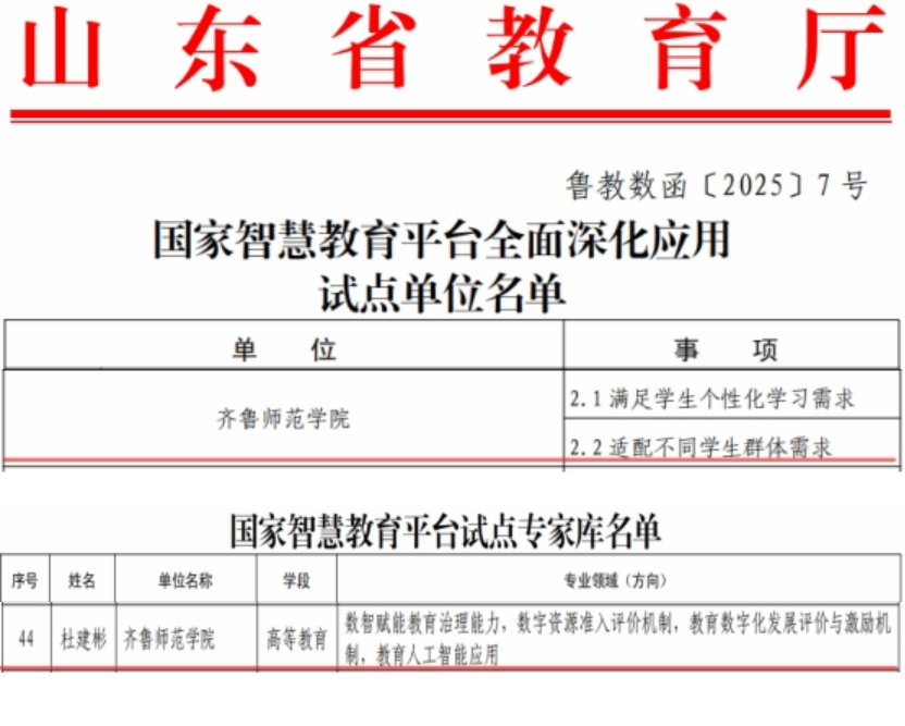 近日,山东省教育厅印发《关于开展国家智慧教育平台全面深化应用试点工作的通知》(鲁教数函〔2025〕7 号),公布了全省“国家智慧教育平台全面深化应用”试点单位及专家库名单。学校成功入选试点高校,承担“数字赋能大规模因材施教试点”任务中“满足学生个性化学习需求、适配不同学生群体需求”两个事项的试点工作;信息科学与工程学院院长杜建彬教授入选国家智慧教育平台试点专家库。