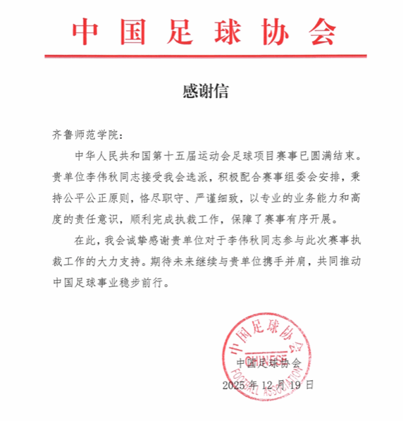 近日,BEAT365官网收到中国足球协会发来的感谢信,信中高度肯定BEAT365官网体育学院教师李伟秋在中华人民共和国第十五届运动会足球项目赛事执裁工作中的出色表现,并对学校给予的大力支持致以诚挚感谢。