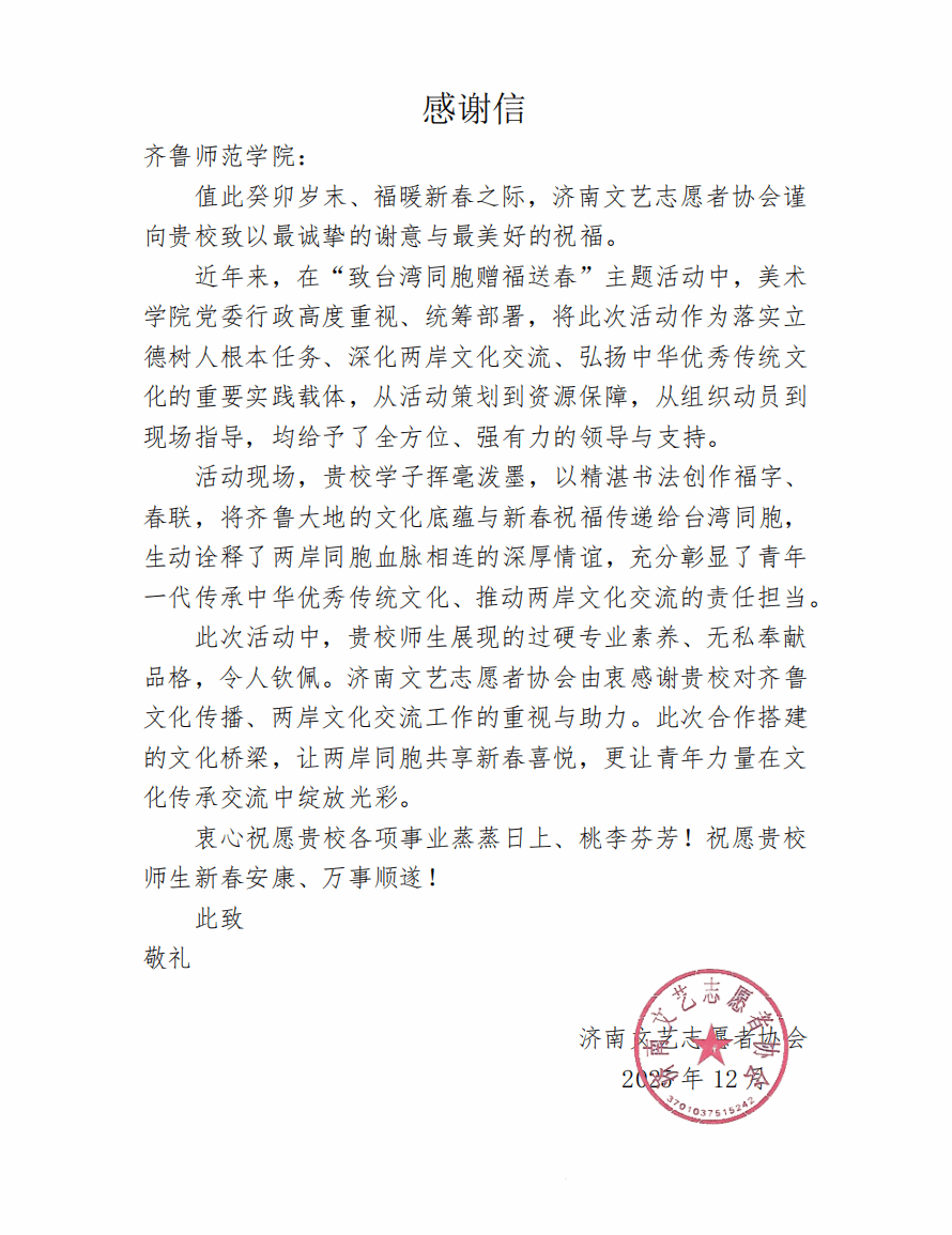 近日,济南文艺志愿者协会向学校发来感谢信,对学校美术学院师生连续三年积极参与“致台湾同胞赠福送春”主题活动,以及从中展现出的奉献精神致以诚挚谢意。